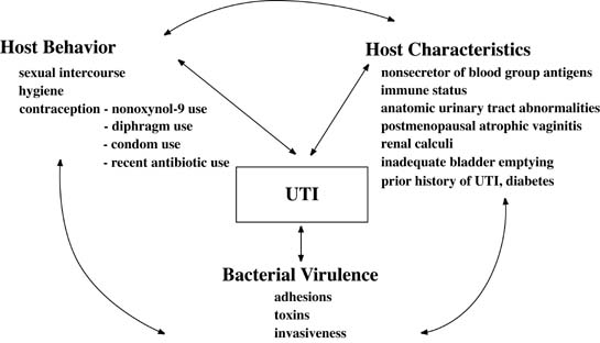 UTIs usually arise from bacteria that colonize the anterior urethra and/or vaginal introitus. These bacteria gain entry to the urinary tract by ascending into the urethra and bladder. Hematogenous seeding from bacteremia (usually S. aureus) or lymphatic spread is a rare cause of UTIs. Unresolved infectious foci in the kidney or previous infection from renal calculi may seed the bladder. Community-acquired UTIs usually result from a retrograde ascent of bacteria in the external urethral meatus and/or vaginal introitus to the bladder. The proximity of the urethra to the vagina and rectum allows fecal flora (with coliforms such as uropathogenic E. coli) to colonize the periurethral area of women. Women with recurrent UTIs have colonization of the vaginal and urethral areas with the uropathogen before the onset of infection.20 The relatively short urethra of women in comparison with men and the mechanical effect of sexual intercourse facilitates movement of bacteria into the bladder and explains the 50-times greater UTI rate in women than in men and the connection between UTIs and sexual activity. A critical step in colonization and subsequent infection of the lower urinary tract is the ability of bacteria to adhere to vaginal epithelial and urethral and bladder urothelial cells. Pathogenic E. coli possess pili or fimbriae, which are long, filamentous protein surface appendages. Pili have adhesion antigens and promote adherence to receptors on epithelial cells.21 Because pili are not always essential for the adherence of bacteria, it remains unclear how epithelial cells vary in their susceptibility to attachment of bacteria. Several studies have investigated bacterial adherence to uroepithelial cells. Strains of E. coli from women with pyelonephritis adhered to epithelial cells in much greater number than did strains of E. coli from those with asymptomatic bacteriuria or strains from feces.22 Larger numbers of bacteria adhere to urothelium or buccal cells of women with recurrent UTIs than in women without UTIs.23,24 These later data indicate a genetic susceptibility to UTIs determined by adherence of bacteria to uroepithelial cells. A genetic predisposition to UTIs is also suggested by findings of an increased risk of UTI and increased epithelial binding of E. coli in women who are nonsecretors of blood group antigens than in those who do secrete these antigens.25,26 Two glycolipids isolated from the nonsecretor epithelial cells had binding sites for bacteria that appear to explain the increased risk of infection in nonsecretors. Once attachment to the urothelium occurs, bacterial virulence factors other than adhesion come into play. Uropathogenic E. coli have virulence factors not present in nonuropathogenic clones. Most uropathogenic E. coli produce hemolysin (which may be important in cell damage and bacterial growth), may produce siderophores like aerobactin, produce increased K1 capsular antigen that protects bacteria from phagocytosis, and release endotoxins. E. coli may alter its behavior and invade macrophages, becoming an opportunistic intracellular organism.27 It is even possible that these hidden E. coli are able to cause recurrent infection and evade antibiotic therapy. Even without these mechanisms, an abundant reservoir of bacteria is present to colonize the periurethral area and cause recurrent ascending UTIs. Several host defense mechanisms protect against infection. The flushing and diluting effects of urine and voiding help clear the bladder of bacteria. Bacteria are inhibited in urine, which is acidic and has a high urea level and high osmolality. The renal cortex is resistant to infection, whereas the renal medulla is very susceptible, because high urine osmolality inhibits leukocyte migration and phagocytosis. A summary of potential interactions between behavior, host characteristics, and bacterial virulence factors are shown in Figure 1. A small inoculum of bacteria into the bladder usually does not cause infection, but a large inoculation of bacteria, particularly fimbriated virulent uropathic strains in nonsecretor women, leads to UTI. Additionally, use of nonoxynol-9, male condoms, and particularly nonoxynol-9 coated condoms,28 poor personal hygiene, and frequency of sexual intercourse contribute to the increased susceptibility to UTIs.