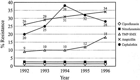 Young women with acute uncomplicated pyelonephritis and mild symptoms can be treated as outpatients with oral antibiotics.45 A 7- to 14-day course of oral antibiotics with trimethoprim-sulfamethoxazole or a fluoroquinolone is appropriate if nausea or vomiting are not present and adequate compliance and follow-up take place. In a double-blind randomized study of 254 premenopausal women, clinical improvement or resolution of symptoms occurred in 96% of women after 7 days of ciprofloxacin and in 83% after 14 days of trimethoprim-sulfamethoxazole.46 The greater efficacy of both bacteriologic and clinical cure rates with ciprofloxacin were caused by trimethoprim-sulfamethoxazole resistance in infecting organisms. Most patients with pyelonephritis require hospital admission. Hospital admission is necessary for an uncomplicated episode of acute pyelonephritis with nausea, vomiting, or suspected sepsis. Patients with complicated infection related to a catheter, urologic surgery, or renal tract abnormality also require hospitalization. The IDSA guidelines also addressed acute pyelonephritis in women.40 Parenteral therapy or oral therapy with fluoroquinolones is the first-line agent for moderate to severe pyelonephritis and can be initiated until culture results are available. The traditional approach to therapy with ampicillin or an extended-spectrum cephalosporin plus an aminoglycoside is an alternative, but the increased resistance of E. coli to ampicillin makes this a second-line therapy. If the infecting organism is known to be Gram-positive, the IDSA recommends ampicillin/sulbactam with or without an aminoglyside.40 The clinical illness with pyelonephritis usually abates within 48 to 72 hours of the onset of therapy. Oral therapy can be started once the patient is afebrile and able to take oral fluids. A total of 14 days of antibiotic therapy is indicated for pyelonephritis to prevent recurrence.47 Persistent symptoms after 72 hours of antibiotic therapy usually require further investigation with ultrasonography or computed tomography to investigate for urinary tract obstruction or abnormalities or to detect renal abscess. Complicated cases of pyelonephritis may require longer courses of therapy and urologic consultation. Treatment of asymptomatic bacteriuria offers no benefit for most healthy, adult, nonpregnant women. Some studies have suggested increased mortality rates in elderly patients with bacteriuria, particularly those who are hospitalized,48but these patients often had multiple confounding variables, including catheterization.49 Generally, treatment of asymptomatic bacteriuria is not necessary even in elderly women.50 ASB frequently resolves without treatment and has no long-term medical consequences. ASB is three-times as common in diabetic patients as in women without diabetes mellitus. A recent double-blind placebo-controlled study showed treatment of ASB in diabetic women did not reduce the complications including the number of symptomatic UTIs or hospitalizations.51 However, screening of and treatment for asymptomatic bacteriuria should be performed in women before urologic surgery, in pregnant women, and in patients with neutropenia or renal transplant. Many women have infrequent episodes of acute uncomplicated UTI, and approximately 3% experience recurrences often enough to consider prophylactic treatment. Recurrent UTIs occur by at least two different mechanisms. The most common is a new infection or re-infection from the bowel and vaginal reservoir. These patients often have a cluster of infections over a short time period and then have infection-free intervals of 6 to 12 months.52 A less common mechanism of relapse occurs from persistent infection with the same bacteria and strain, usually at close intervals. Relapsing infections also may be associated with a complicating factor such as urinary tract abnormalities or calculi. Sometimes factors associated with UTIs can be avoided or altered. Voiding immediately after intercourse may reduce the incidence if intercourse is temporally related to infections although this technique is unproven.53 Changing from a diaphragm and spermicide or condoms to a different form of contraception that does not include nonoxynol-9 may be effective in preventing infection. Three antibiotic prophylactic treatment regimens are effective to reduce recurrent infections. First, if reinfection correlates with sexual intercourse, a single-dose antibiotic postcoital strategy can be used.54 Second, self-start intermittent therapy with either single-dose or 3-day therapy is a reasonable option for women with relatively infrequent infections (two to three times per year). Trimethoprim-sulfamethoxazole is an inexpensive choice of antibiotic for either of these strategies. The third strategy consists of continuous low-dose prophylaxis with trimethoprim, trimethoprim-sulfamethoxazole, nitrofurantoin, or norfloxacin and is highly effective in suppressing infections for women with frequent recurrences.55,56 Therapy is usually continued for 6 months, but infections often recur after suppressive therapy is discontinued. Estrogen vaginal cream is highly effective for reducing recurrences in postmenopausal women with recurrent infections.57,58 Topical estrogen therapy lowers vaginal pH, restores atrophic mucosa, and increases lactobacilli while reducing vaginal colonization with Enterobacteriaceae from 67% to 31%.42 UTIs were reduced from 5.9 to .5 episodes per patient-year, probably as a result of alterations in vaginal flora.58 The Estring vaginal ring, used in a randomized, open, parallel study of postmenopausal women, prolonged the time to UTI recurrence and decreased the number of recurrences per year compared with controls.59 Cranberries and cranberry juice appear to reduce the incidence of UTIs because of proanthocyanidins inhibiting adherence of p-fimbriated E. coli to the urothelium.60,61,62,63,64 In elderly women, 300 mL daily of cranberry juice taken
