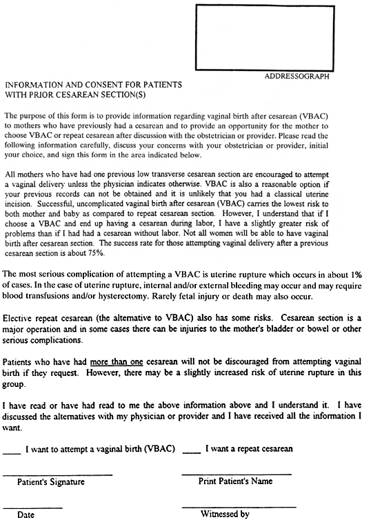 Predicting Success of Vaginal Birth After Cesarean The patient who is pondering VBAC will frequently ask her obstetrician to estimate her chance for a vaginal birth. She may believe that her body is abnormal and that she is physically unable to deliver without surgery. In fact, such anatomic abnormalities are quite uncommon. Most studies have found the success rate for VBAC to be approximately 75% when patients with all indications for primary cesarean are included. Thus, the likelihood of vaginal birth for a woman attempting VBAC is similar to that of a nulliparous patient with no prior cesarean. A meta-analysis of 29 studies found that VBAC success rates ranged from 67% for patients with prior failure to progress in labor to 85% for patients with a prior cesarean for breech presentation.15 The authors concluded that there appeared to be no variables studied for which success rates were so low that trial of labor would constitute inappropriate patient care. More recently, attempts have been made to develop VBAC scoring systems to predict VBAC success rates.16 These systems are helpful in identifying the 5% of patients at each end of the spectrum who are very likely to succeed or very likely to fail. Unfortunately, these systems are not very predictive for the remaining 90% of VBAC candidates. Additionally, those patients most likely to fail a trial of labor (e.g. the patient with a prior cesarean for failure to progress who has had no prior vaginal birth and who is now postdates with an unfavorable cervix) can be predicted without the aid of any scoring system. How Does Prenatal Care Differ From That of a Patient With No Prior Cesarean? Attempts to ascertain the type of previous uterine incision should begin early in the course prenatal care. If a prior classical uterine incision is confirmed, it is prudent to schedule the patient for elective repeat cesarean as soon as American College of Obstetrics and Gynecology (ACOG) criteria are met and to warn her to call immediately if she begins to have contractions. This is because a classical uterine incision, unlike the common low transverse incision, has a propensity to rupture before the onset of labor. Patients without contraindications to trial of labor should be informed of their options and offered their choice of VBAC or elective repeat cesarean. In many cities, the International Childbirth Education Association (ICEA) and/or American Society for Psychoprophylaxis in Obstetrics (ASPO/Lamaze) offer VBAC classes in which the risks versus benefits of these two options are discussed in detail. If placenta previa is identified in a patient with one or more prior cesarean sections, the obstetrician should be aware of the possibility of placenta previa accreta. Finally, prenatal care of the patient with a prior cesarean delivery includes informed consent issues. What Constitutes Informed Consent for Vaginal Birth After Cesarean? The topic of informed consent for VBAC remains controversial. At issue is exactly how much information must be imparted to constitute truly informed consent. If doctors discussed every potential problem that could develop during any pregnancy, many women would never have children. Such a misguided attempt at risk management would strike needless fear into the hearts of the millions of women who experience uncomplicated pregnancies each year. Textbooks and journals are filled with accounts of horrible complications that, fortunately, occur very rarely. The goal of informed consent is to present clinically significant risks, benefits, and alternatives in an understandable and unbiased fashion. In the case of VBAC (assuming the primary uterine scar was not classical), the patient should understand that the risks of pregnancy and labor are almost identical to those faced by a patient with no prior cesarean. The one exception is the increased risk of uterine rupture. Patients considering VBAC should be informed that in about 1 of 100 cases the uterus will rupture during a trial of labor. They should also be informed that if the uterus does rupture, there is a significant risk to mother and baby. Finally, a truly informed consent must clearly point out that the alternative to VBAC, planned repeat cesarean, is not risk-free. Must VBAC Consent Be Written? In the early 1980s elective repeat cesarean was still routine at many U.S. hospitals, and VBAC was uncommon. At that time, written VBAC consent forms were commonly used for those women who opted to attempt VBAC. By the early 1990s, VBAC had become so commonplace that most doctors no longer used written VBAC consent forms. However, an article published in 1996 strongly advocated the use of written VBAC consent forms, and that recommendation has gained widespread acceptance.17 In the unusual case of a bad outcome, the written consent will document the fact that the patient was fully informed regarding the risks versus benefits of both alternatives and that she was offered a choice of either VBAC or elective repeat cesarean. A sample consent form is shown in Figure 1. |