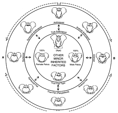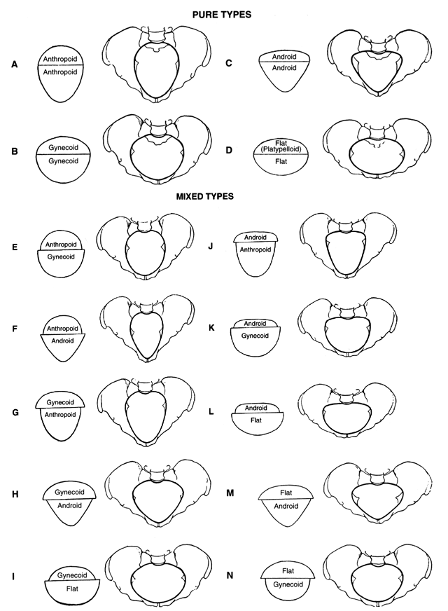 The shape and size of the maternal pelvis has been the subject of significant evaluation and description. Most of current knowledge on this subject originates from the classic contributions of Caldwell, Moloy, and D'Esopo.11,12 The clinical recognition of the different types of pelves is important because of their different capacity, obstetric significance, and resulting prognostic importance.13 The four major types of maternal pelves and their characteristics are outlined as follows: