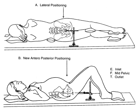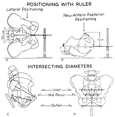 With this technique, the intersecting diameters of the inlet, midpelvis, and outlet are added to give three respective values. The normal ranges for these values are 22 to 24 cm for the inlet, 20 to 22 cm for the midpelvis, and 16 to 18.5 cm for the outlet. Fig. 8 and Fig. 9 show the positioning of the patient for x-ray pelvimetry. Unfortunately, x-ray pelvimetry has fallen short of its expected clinical performance. Several articles have demonstrated its limited role in contemporary obstetric practice.16,17 There are several reasons for this: