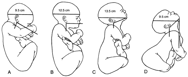 In describing fetopelvic relationships, the clinician should carefully adhere to standard obstetrical nomenclature. Fetal lie refers to the relationship between the long axis of the fetus with respect to the long axis of the mother. The possibilities include a longitudinal lie, a transverse lie, and, on occasion, an oblique lie. Fetal presentation is a reference to the part of the fetus that is overlying the maternal pelvic inlet. The most common relationship between fetus and mother is the longitudinal lie, cephalic presentation. A breech fetus also is a longitudinal lie, with the fetal buttocks as the presenting part. Breech fetuses also are referred to as malpresentations because of the many problems associated with them. Fetuses that are in a transverse lie may present the fetal back (or shoulders, as in the acromial presentation), small parts (arms and legs), or the umbilical cord (as in a funic presentation) to the pelvic inlet. In an oblique lie, the fetal long axis is at an angle to the bony inlet, and no palpable fetal part generally is presenting. This lie usually is transitory and occurs during fetal conversion between other lies. The most dependent portion of the presenting part is known as the point of direction. The occiput is the point of direction of a well-flexed fetus in cephalic presentation. The fetal position refers to the location of the point of direction with reference to the four quadrants of the maternal outlet as viewed by the examiner. Thus, position may be right or left as well as anterior or posterior. Fetal attitude refers to the posture of a fetus during labor. Mammalian fetuses have a tendency to assume a fully flexed posture during development and during parturition. Flexion of the fetal head on the chest allows for the delivery of the head by its smallest bony diameter. A loss of this flexed posture presents a progressively larger fetal head to the bony pelvis for labor and delivery (Fig. 1). The fetal arms and legs also tend to assume a fully flexed posture. The longitudinal posture of the fetus likewise is flexed under normal circumstances. The mechanism of labor and delivery, as well as its inherent safety and efficacy, is determined by the specifics of the fetopelvic relationship at the onset of labor. Further correlations with fetopelvic relationships are important before birth. |