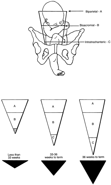 Typically, three views are obtained (Fig. 6). Because most patients will have undergone a failed attempt at ECV, I obtain pelvimetry at that time for the patient selected for a trial of labor. Patients in whom we are unable to convert a breech presentation are unlikely to undergo spontaneous conversion. Alternatively, pelvimetry may be obtained on presentation in early labor. | |||||||||||||||||||||||||||||||||||||||||||||||||||||||||||||||||||||||||||||||||||||||||||||||||||||