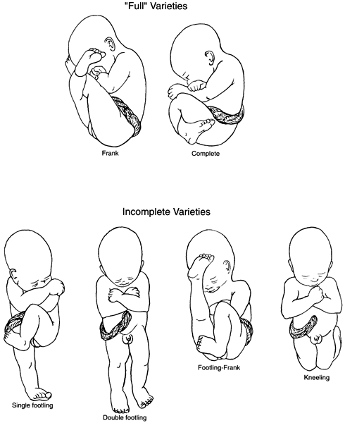 The small size of the premature fetus is further compromised by the specific malpresentations that occur. With less neurologic and muscular control, deflexed or even extended varieties of fetal presentations are seen. Most common are the “incomplete” types of breech presentation, such as footling breech presentations (Fig. 3, (Tables 5 and 6). Deflexion of the fetal head, more commonly seen in preterm fetuses, results in the potential for further compromise at delivery. TABLE 5. Varieties of Breech Presentation