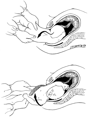The infant then should be handed to the pediatrician in attendance. A segment of umbilical cord for acid-base analysis should be routinely obtained. Attention then can be directed to completion of the third stage of labor, as well as the repair of the episiotomy and genital tract lacerations. A full dictated operative note should be completed at the time of delivery. The entire process of the labor, delivery, and immediate neonatal outcome should be referenced. Mention of each specific step is warranted, along with clinical observations regarding the relative ease or difficulty of the delivery process. |