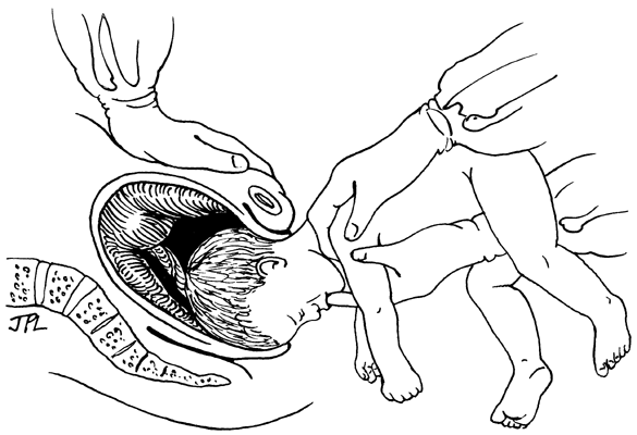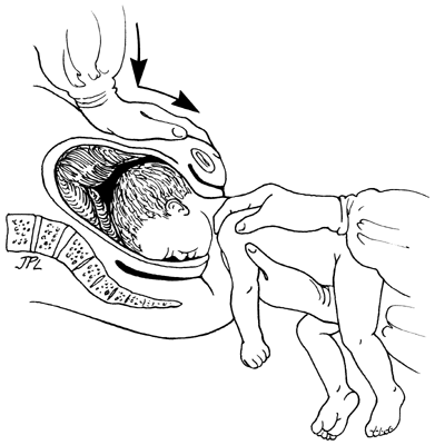 Delivery of the after-coming head follows with manual aid or forceps. A Mauriceau-Smellie-Viet maneuver follows (Fig. 8). The fetus is placed abdomen down on the operator's right arm. The left hand supports the fetal neck. The index and middle fingers of the right hand are placed on the fetal maxilla to help maintain flexion of the head. The assistant may apply suprapubic pressure to expel the after-coming head (Naujok maneuver; Fig. 9). When delivery is further complicated by rotation of the fetal back posteriorly, a Prague maneuver allows for delivery of the occiput posterior breech variant.