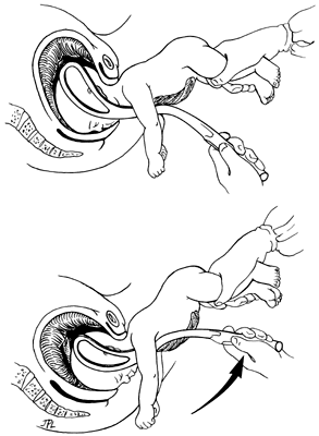 The second stage of labor should be managed under double-setup conditions. A gowned and gloved assistant, as well as anesthesia and pediatrics personnel, should be present. The patient should be instructed and encouraged to push effectively. The fetal heart rate should be continuously monitored. A nullipara should be allowed to push for up to 2 hours, a multipara up to 1 hour. If delivery is not imminent, cesarean delivery should be performed, the diagnosis being a failure of descent. After lateral flexion of the trunk, the anterior hip is forced against and underneath the symphysis. Expulsion follows, with delivery of the anterior and then the posterior buttock. During “crowning,” an episiotomy should be performed to facilitate delivery. Using a modified Bracht maneuver, a warm wet towel is placed around the fetal abdomen, and the fetus is grasped on the posterior aspect of the fetal pelvic girdle with care to avoid the fetal kidneys and adrenal. A gentile downward traction is exerted. After the buttocks are fully expulsed, the back is born by rotation anteriorly. This allows the shoulders to enter the pelvis in the transverse diameter of the pelvic inlet. If there is a failure of anterior rotation, the fetus will be born as a posterior breech, and the sequence of maneuvers used to help in delivery will differ as appropriate. As the anterior shoulder is seen at the introitus, the operator sweeps the right humerus across the infant's chest. Gentile rotation allows for the posterior shoulder and humerus to be born, completing the Løvsett maneuver (Fig. 7). With the infant delivered to the umbilicus, some authors recommend the use of uterine relaxants to facilitate the remainder of the delivery. The use of general anesthesia with halothane has been supplanted by parenteral betamimetics. We have used small aliquots of intravenous nitroglycerin for this purpose.43,44