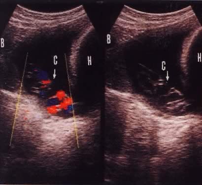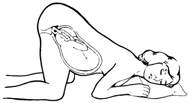 Polyhydramnios or excessive amniotic fluid (index above 25, or vertical pocket of 8 cm) has been shown to increase the risk of umbilical cord prolapse. Many patients with excessive fluid have high station at labor onset. In a retrospective study of more than 60,000 singleton deliveries at term, Maymon and colleagues noted an almost 10-fold increase in the risk of cord prolapse (2.2% versus 0.3%) in patients with hydramnios.14 Multifetal pregnancies have the risk of cord prolapse, and twin pregnancy, even in vertex-vertex presentation, has a higher proportion of cord prolapse with the second twin, requiring cesarean delivery. In a study of 106 sets of vertex-vertex twins, Sullivan and associates noted a 35% incidence of cord prolapse in the second twin among those who required cesarean delivery of the second twin.15 Abnormal cord insertion, placenta previa, and low-lying placenta also are risk factors for prolapse of the cord. Antepartum Diagnosis and Management Funic presentation before rupture of membranes is a predisposing factor to umbilical code prolapse. This is visualized on ultrasound in approximately 1 in 167 (0.6%) live births.16 The increased use of antepartum obstetric ultrasound, especially with color flow Doppler, has assisted in making the diagnosis of a presenting cord and preparing for cesarean delivery before overt or occult prolapse. Figure 2 illustrates the usefulness of color flow Doppler in this diagnosis. Every patient with fetal malpresentation, multiple gestation, or known abnormal placentation should undergo ultrasound examination before labor to exclude the possibility of funic presentation. Ultrasound also can be helpful for the preterm fetus in assessing the contents of hour-glassing membranes. During labor, the diagnosis of cord prolapse must be in the differential diagnosis whenever fetal heart rate abnormalities are noted, especially recurrent variable decelerations. If risk factors for cord prolapse are present, gentle vaginal examination should be performed, possibly with the assistance of confirming bedside ultrasound. Once the diagnosis has been confirmed, the cord should be manipulated as little as possible because the vessels of the cord may spasm and further compromise blood flow. Cervical dilation, effacement, and station of the presenting part should be ascertained. Because of the possibility of spasm, controversy exists as to whether an attempt at replacement of the cord should be done. If the cervix is completely dilated and rapid vaginal delivery is feasible, then an effort at replacement is not harmful, during which simultaneous preparations for abdominal delivery are made. The patient should be immediately repositioned in knee-chest position (Fig. 3), which reduces the pressure of the presenting part on the cord. If the patient is unable to assume the knee-chest position because of epidural or body habitus, or for patient comfort during prolonged positioning, steep Trendelenburg position also may be used. Oxygen should be administered to the mother. In addition, the examiner's hand should remain in the vagina to manually elevate the presenting part, if possible. Another technique described by numerous authors is that of filling the mother's urinary bladder with 500 to 1000 mL of fluid to assist in elevating the presenting part while preparations for delivery are made. This may be combined with the maneuvers previously described. If the cord has prolapsed beyond the introitus, it should be wrapped in sponges or a sterile towel soaked with warm saline. Another useful therapy is to decrease force and frequency of contractions of labor using subcutaneous terbutaline. Immediate delivery is the treatment of choice, providing the fetus still is viable.