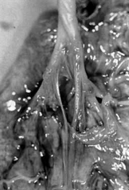 Other abnormalities of the umbilical cord can complicate labor and delivery. The umbilical cord normally inserts near the center of the placenta. In approximately 1% of placentas, the cord insertion is on the membranes, known as velamentous insertion.1 The umbilical vessels course over the membranes separately, without the protection of Wharton's jelly and thus are more vulnerable to trauma, including rupture of membranous vessels and vasa previa (Fig. 4). Vasa previa, occurring in 1 of 200020 to 5000 deliveries, is a variation of a funic presentation, although it carries possibly more serious risks, since the unprotected umbilical vessels precede the presenting part. Spontaneous rupture of the vessels can occur, or iatrogenic laceration can occur during artificial rupture of membranes or other obstetric manipulation, including cervical ripening, insertion of monitoring devices, or scalp gas sampling. If the vessels are lacerated, rapid fetal exsanguination can occur if delivery is not accomplished immediately. Mortality rate of 70% to 100% is expected with ruptured vasa previa.21 Vasa previa is suspected if severe fetal heart decelerations occur immediately after a vaginal examination, since the vessels spasm in response. Sinusoidal fetal heart rate patterns also are associated with compression of the umbilical vessels in vasa previa. When vaginal bleeding is associated with rupture of the membranes, vasa previa must be suspected, especially if fetal heart rate decelerations occur out of proportion to the amount of bleeding. If brisk vaginal bleeding ensues with fetal bradycardia, emergent delivery is indicated. Theoretically, Kleihauer-Betke or the Apt test can be used to determine if the bleeding is from fetal or maternal source, although in reality, if laceration of fetal umbilical vessels has occurred, there is little time to waste, since total fetal blood volume is only 300 to 500 mL. Ultrasound has been used to assess umbilical cord insertion, especially in pregnancies that have a high risk of abnormal insertions. Velomentously inserted cords are associated with twins and two-vessel cord as well as marginal, bilobed, and low-lying placentas.20 Ultrasound evaluation of the umbilical cord throughout its length is best done between 24 and 27 weeks. During this period, it is possible to characterize the cord in over 90% of patients, including the insertion.22 Vasa previa is thought to evolve from an early placenta previa, or low-lying placenta. As the uterus grows, the placenta “recedes” from the cervical os while the membranes, with the vessels attached, remain at the os until delivery.23 Ultrasound assessment before labor should be considered in any patient with a history of early placenta previa or low-lying or marginal placenta to exclude vasa previa. Three-dimensional ultrasound also has been shown to clearly identify velamentous insertion and vasa previa. Patients in whom vasa previa is known or suspected can be monitored closely, educated, and delivered electively by cesarean section before the onset of labor. |