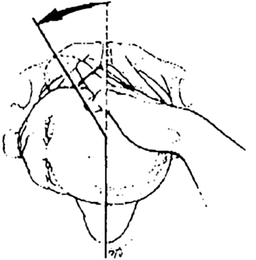 The first step in management is anticipation of shoulder dystocia, including recognition of the previously described antepartum and intrapartum risk factors. Every effort should be made to prepare a rapid, ingrained, and well-coordinated stepwise plan. When fetal macrosomia is suspected, the patient should be thoroughly counseled regarding the risks and benefits of a trial of vaginal delivery.37 At the time of delivery, if shoulder dystocia is a concern, some clinicians have empirically advocated immediately proceeding to delivery of the fetal shoulders to maintain the forward momentum of the fetus. Others support a short delay in delivery of the shoulders, arguing that the endogenous rotational mechanics of the second stage may spontaneously alleviate the obstruction. Shoulder dystocia usually is heralded by the classic “turtle sign.” After the fetal head delivers, it retracts back onto the maternal perineum. As maternal efforts to expel the fetal body continue, the fetal shoulder becomes further impacted behind the symphysis pubis. If the physician is alone, immediate assistance should be recruited. Additional support from anesthesia, nursing, and pediatrics also should be recruited. The mother should be instructed to stop pushing while attempts are made to dislodge the impacted shoulder. Most cases of shoulder dystocia resolve within a few minutes, although it may seem longer. McRoberts Maneuver The McRoberts maneuver is recommended as the initial technique for disimpaction of the anterior shoulder. In a retrospective review of 236 cases of shoulder dystocia occurring between 1991 and 1994 at Los Angeles County-University of Southern California Medical Center, this maneuver alone alleviated 42% of cases.38 When combined with suprapubic pressure, the McRoberts maneuver results in resolution of 58% of cases.39 Trends toward lower rates of maternal and neonatal morbidity have been associated with the McRoberts maneuver.38 Objective testing also has shown that the McRoberts maneuver may reduce fetal shoulder extraction forces and brachial plexus stretching.40 The McRoberts maneuver involves flexion of the mother's legs onto her abdomen. An x-ray study of the McRoberts maneuver confirms that it is associated with an increase in the mean angle of inclination between the symphysis pubis and the sacral promontory. There also was a 24% decrease in the angle created by drawing a line bisecting the symphysis pubis relative to the horizontal. With the McRoberts maneuver, the angle created by a line bisecting the longitudinal axis of the fifth lumbar vertebra and the longitudinal axis of the upper sacrum also increased.41 The McRoberts maneuver does not change the actual dimensions of the maternal pelvis; instead, it presumably works by straightening the maternal sacrum relative to the lumbar spine, with consequent cephalic rotation of the symphysis pubis. This position is thought to also enhance passage of the posterior fetal shoulder over the sacrum and through the pelvic inlet, positioning the plane of the pelvic inlet to its maximal dimension perpendicular to the maximum maternal expulsive force. Limitations of the technique include the need for two assistants and the extra time required to elevate and flex the patient's legs. Potential difficulty also can be encountered in moving the very obese patient or the patient with a dense epidural motor blockade. The need for additional maneuvers after the McRoberts maneuver has been associated with larger fetal birth weights, longer active phases, and longer second stages of labor.38 Simultaneous suprapubic pressure, applied either posteriorly or laterally, can displace the impacted shoulder into the oblique diameter and effect delivery. Because shoulder dystocia is considered to be a “bony dystocia,” cutting a proctoepisiotomy may not be necessary. If the McRoberts maneuver fails, however, enlarging the episiotomy may allow more room for the next proposed maneuver. Fetal Manipulation In the Woods (corkscrew) maneuver (Fig. 1), the practitioner pushes the posterior shoulder through a clockwise 180-degree arc by applying pressure on the anterior surface of the posterior shoulder. In the reverse Woods maneuver, or Rubin maneuver (Fig. 2), pressure is applied to the posterior surface of the anterior shoulder to effect counterclockwise rotation of the posterior shoulder.