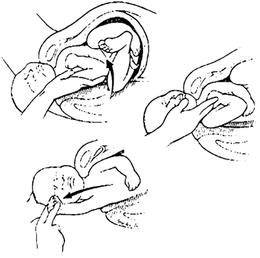 Should these maneuvers fail, the physician's hand can be passed into the vagina following the posterior arm to the elbow. After pressure is applied at the antecubital fossa to flex the fetal forearm, the arm is swept out over the infant's chest and delivered over the perineum (Fig. 3). Rotation of the fetal trunk to bring the posterior arm anteriorly may be required.