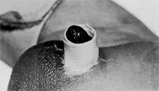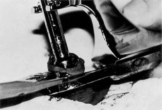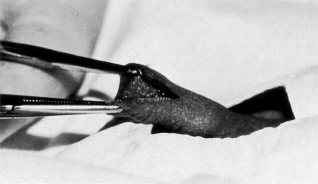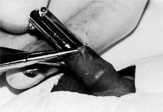 When correctly applied, the rim of the Gomco Bell lies below the apex of the original dorsal slit, slightly distending the prepuce. Once the bell is in place, the clamp is assembled. The foreskin is carefully drawn up between the bell and body of the clamp using the mosquito hemostats. Once the Gomco is fully assembled and before compression is applied, the operator checks to be certain that the full length of foreskin marked by the original dorsal slit is drawn into the clamp and that the application is symmetric. If the apex of the original dorsal slit is not included in the skin removed, an unsightly cleft and a site for potential bleeding results. Once the surgeon is satisfied, and after assuring that the foot of the clamp is correctly inserted into the base plate, the finger nut of the clamp is firmly screwed in place. This crushes the foreskin between the bell and body of the clamp. The isolated, avascularized foreskin is then excised with a scalpel (Fig. 5). Electrocautery should never be used for this purpose because of the possibility of extensive injury to the penis. The clamp is left in place for several minutes to ensure hemostasis. Operators vary greatly in recommending how long the clamp should be allowed to remain.20 Yellen recommended waiting for 5 minutes114; however, many surgeons remove the clamp immediately after completing the procedure.