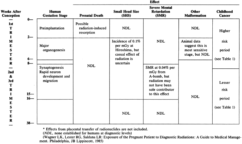 The potential teratogenic and carcinogenic effects of diagnostic x-rays and radionuclide radiations on the conceptuses of pregnant women are a major concern when considering diagnostic imaging studies. The physician must make a medical decision regarding the benefits to be derived from the study versus the potential adverse consequences that such a study may have on the patient's progeny. In addition, some patients receive diagnostic x-ray studies for symptoms not related to pregnancy and are later discovered to have been pregnant at the time of the examinations. In these cases, medical decisions regarding the future of the pregnancy may become necessary in light of the exposure to ionizing radiation. There is no definitive evidence that diagnostic levels of ionizing radiation can cause adverse effects in the conceptuses of pregnant women. Diagnostic studies deliver less than 10 milligray (mGy) of radiation to a conceptus for the vast majority of common examinations. (Note: 10 mGy = 1 rad). Doses in excess of 100 mGy (10 rad) are rare and might be encountered in certain pelvic computed tomographic studies or other extensive pelvic examinations. Doses in excess of 250 mGy (25 rad) almost never occur. Based on observations in humans, doses in the range of 250 mGy or less have been correlated with the following: An increase in the likelihood that the child might develop cancer (including leukemia) if the radiation is delivered anytime after conception, the greater risk period being the first trimester1,2 An increase in the likelihood of small head size (SHS) if the radiation is delivered at the second through the 15th week following conception3,4 An increase in the likelihood of severe mental retardation if the radiation is delivered at the eighth through 15th week following conception5 A decrease in intelligence scores (Koga) if exposure occurs between the eighth and 25th weeks following conception6,7 Based on studies in animals it has been suggested that the most sensitive period for radiation-induced malformations in humans, of types other than those mentioned above, is the second through the eighth week following conception,8,9 (i.e., the period of major organogenesis). However, the malformations most commonly seen in animals have not been observed in human populations exposed to less than 250 mGy (25 rad).10 Other animal data11 suggest that radiation-induced resorption of the conceptus may be possible at doses of 50 mGy (5 rad) or more if delivered prior to implantation. To assess whether or not low doses of ionizing radiation might be the cause of the correlated effects observed in humans, it is necessary to determine whether or not the human data are reproducible in other exposed populations; whether there were any other risk factors present in the. populations studied, to see if these may have contributed to the findings; and whether the observed effects in humans can be corroborated by controlled studies in animals. |