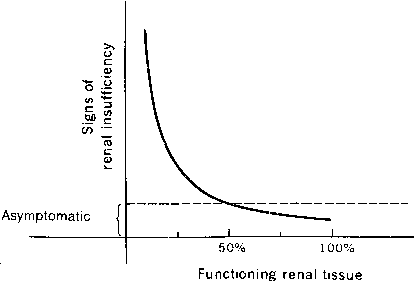 Tests of renal function in pregnancy must be interpreted in relation to the changes in plasma volume, glomerular filtration, and tubular reabsorption that normally occur with advancing gestation. Many of the commonly used tests of function yield lower results in pregnancy than in the nonpregnant state. Consequently, values that may be regarded as normal in the nonpregnant state may well indicate renal dysfunction in pregnancy. Uric acid, blood urea nitrogen (BUN), and serum creatinine levels are crude indices of renal function. In pregnancy, plasma uric acid usually decreases by 25% beginning in the first trimester and increases during the third trimester. Upper normal limits of plasma uric acid levels are 5 to 5.5 mg/dL in pregnancy.4 Levels are influenced by race, multiple gestation, and time of day sampled, with higher levels in the morning. An indicator of renal filtration, the BUN normally decreases from nonpregnant levels of 12 mg/dL (4.3 mmol/L) to 9 mg/dL (3.2 mmol/L), and plasma creatinine levels decline from a nonpregnant mean value of 0.7 mg/dL (62 mmol/L) to 0.5 mg/dL (44 mmol/L).1 If the plasma creatinine level exceeds 0.80 mg/dL (80 mmol/L) or the BUN is greater than 14 mg/dL at any stage in pregnancy, renal dysfunction should be suspected and more detailed investigation should be performed. The kidney and liver affect serum urea levels. The liver synthesizes urea, which is influenced by protein intake, metabolism, and hepatic function. Urea reabsorption is by the kidneys and varies with hydration. Therefore, it is possible for renal function to be normal in the presence of an abnormal BUN or abnormal in the presence of a normal BUN. In addition, renal function must decline by at least 50% before either the BUN or the creatinine level becomes abnormal, where clinical signs of renal insufficiency become apparent (Figs. 1 and 2).