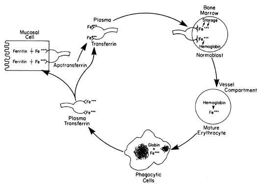 Gastric acid degrades the organic iron complexes (vegetable protein) and reduces the trivalent mineral to ferrous iron. Moreover, hydrochloric acid serves to prevent alkaline dietary constituents from forming insoluble complexes with ferrous iron, to prevent various agents from oxidizing iron to the ferric state, and to prevent iron precipitating as insoluble ferric hydroxide. While gastric juice may facilitate elemental iron absorption, it does not appear to have any effect on hemoglobin iron absorption. The alkaline milieu of the duodenum and upper small bowel favors absorption, since the ferrous iron has greater solubility in these surroundings; this is true for all three sources of iron, but it is particularly necessary for hemoglobin iron. Therefore, agents that form alkaline-soluble complexes promote iron absorption; these include the reducing agents ascorbic acid, fructose succinic acid, lactate, pyruvate, and sorbitol and certain amino acids such as cysteine. Certain drugs such as hydroquinone and alcohol may also increase iron absorption by increasing gastric acid production, while medications that decrease intestinal motility, such as atropine or reserpine, also enhance iron absorption. Bile may have a limited role in facilitating iron absorption, but pancreatic secretions are thought to be noncontributory. In contrast, oxidants and certain medications reduce iron absorption by increasing the concentration of the trivalent form. Other substances form insoluble complexes with the ferrous iron; chelators have a similar mode of action. Metallic cation competitors decrease absorption by competing for binding sites, while other agents reduce absorption by reducing gastric acidity. Cathartics and disease processes reduce iron absorption by increasing intestinal motility, reducing the time of exposure of mucosal cells to iron. Surgical removal of the gastric or duodenal mucosa limits the surface area for absorption. Finally, another factor, pica, has long been associated with IDA. Pica is the ingestion of various substances that have no dietary value; pagophagia (ice), geophagia (clay), and amylophagia (starch) are examples. In some ethnic groups, it is a common associated finding in over 60% to 80% of patients with proved IDA. The “cravings” these patients experience are not always for nonfoods, but may be for vegetables (carrots or celery) or commercial items such as “fast foods” (invariably not a good source of iron). Formerly all forms of pica were thought to retard absorption of iron. Now it is clear that pica is a sign of IDA rather than a cause. A history of pica in an adult suggests that the patient has IDA, since the abnormal craving usually disappears in a few days after the institution of iron supplementation. It is not proved but may be inferred that certain food fetishes during pregnancy may represent pica due to the increased iron demands of pregnancy. This hypothesis is supported by the observation that most pica occurs after the 20th week, a time during which the iron demands increase most rapidly. The relationship of pica to IDA is not completely understood; however, it seems to be related to a decrease of iron-containing enzymes in the oral mucosal cells of these patients. The regulatory mechanism of iron uptake is closely related to the plasma iron turnover rate (see Fig. 6). It appears that transferrin from the labile pool is deposited into the developing mucosal cells destined to form the basal layer of the crypts of Lieberkühn in the duodenum. This protein controls the amount of iron absorbed by trapping the metal entering the cell. The conversion of the absorbed ferrous iron into ferritin is a metabolic process that requires a chelator, such as ascorbic acid, an energy source (probably adenosine triphosphate), and, finally, oxidation of the divalent iron to the ferric iron, which requires ceruloplasmin (see Fig. 7). This sequence is adequate for elemental iron and vegetable protein iron absorbed as the simple ferrous cation. However, hemoglobin or myoglobin iron must be further degraded by a microsomal enzyme called heme oxygenase. Once the mucosal cells are saturated with ferritin iron absorption is halted. If the iron stores are reduced, very little ferritin is present in the mucosal lining and iron is absorbed rapidly through the cell, by transferrin, into the bloodstream. In contrast, during iron sufficiency, increased amounts of cellular ferritin are present and the iron is either stored as ferritin or is not absorbed. Ferritin is lost as the duodenal mucosal cell matures and works its way from the base of the crypt to the luminal border. The mucosal cell control of absorption is not, however, absolute; it can be overcome if the concentration of iron at the intestinal lumen increases sufficiently, as in toxic overdoses. If large amounts of iron are presented chronically, hemochromatosis may eventually result. The transport of iron from the mucosal cell to the utilization pool is performed by transferrin (see Fig. 6). When iron is required by the marrow, transferrin obtains trivalent iron from the ferritin in the mucosal cells. The ferric iron binds to one of the glycoprotein moieties of transferrin, is transported to the marrow, and is used for hemoglobin synthesis. The transferrin binds briefly on the normoblast membrane, where it delivers one or both iron atoms. During the binding process, transferrin may partially enter the cell by a process of endomitosis and actually participate in hemoglobin formation. The release of iron is an active process that can be abolished by enzyme inhibitors. Although direct transfer of transferrin to the normoblast is thought to be the major pathway, rhophenocytosis (accepting of transferrin by reticuloendothelial cells) may represent a minor pathway. Once the iron transferrin complex is attached to the receptor site inside the normoblast, it is conjugated to a protein molecule with a molecular weight of approximat