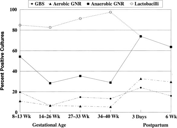 Microbes that cause obstetric infection can be considered of exogenous or endogenous origin. Exogenous organisms are usually single pathogens acquired through environmental exposure and are not a normal part of the genital tract flora. Prominent examples are STD organisms (Neisseria gonorrhoeae, Chlamydia trachomatis, Trichomonas vaginalis, Treponema pallidum, herpes simplex virus type 2, HIV); organisms or entities associated with obstetric or surgical epidemics (toxic shock syndrome, group A streptococci, Staphylococcus aureus [mastitis], methicillin-resistant S. aureus, vancomycin-resistant Enterococcus); organisms or entities associated with poor hygiene or sanitation on a community level (Salmonella, Vibrio cholerae, tuberculosis, staphylococcal toxin–related food poisonings); and organisms associated with community epidemics (“common cold,” Neisseria meningitis, influenza virus types A and B). The acquired immunodeficiency syndrome (AIDS) epidemic has expanded the role of antibiotics to treat infections caused by opportunistic organisms. The most common obstetric infections (urinary tract infections, intra-amniotic infection, postpartum endometritis, and postoperative wound infections) are associated with endogenous flora of the gastrointestinal tract, vagina, or skin. The most important source is the vaginal flora; it is the source of the common, polymicrobial upper genital tract infections, postpartum endometritis, and intra-amniotic infection. The anatomy, microenvironment, and function of the vagina are uniquely suited for colonization and growth of bacteria. The vagina is a warm, moist environment that is enriched regularly with nutrient-containing body fluids (genital tract fluids, semen). Colonization from the gastrointestinal tract and exogenous bacterial communities (i.e., sexual activity) occur regularly.2 Without adequate host defense, the sterile upper genital tract, products of conception, and abdomen are vulnerable to infections. The immunology of the female genital tract is poorly studied and poorly understood, especially during pregnancy.3 A coalition of systems involved with cellular and humoral immunity provides immunoglobulins and an array of general and committed neutrophils, lymphocytes, and macrophages as an excellent first defense against upper genital tract invasion. The location, interaction, and control of vaginal immunology are being explored. A second major mechanism of defense is the normal microflora, which competitively inhibits and reduces other more pathogenic microflora, such as the Enterobacteriaceae or anaerobes. The organisms that have received the most interest and study are the lactobacilli that produce hydrogen peroxide (H2O2). These organisms play a major role in maintaining a normal vaginal microenvironment.4 Women with greater than 10 colonies/g secretion of H2O2-producing lactobacilli have a lower vaginal pH, lower incidence, and a lower colony count of the pathogens. The lactobacilli act through a reduced ability to buffer an acid environment, a greater tolerance of acidic environments, and direct killing effects of H2O2 and other compounds.4 Although it is relatively easy (but expensive) to determine the incidence of various bacteria in the vagina, quantitative measurement, especially with obligate anaerobes, is difficult and has been conducted only by a few research laboratories on primarily nonpregnant women. The incidence of Enterobacteriaceae, anaerobes, and lactobacilli during pregnancy is shown in Figure 1.5 For most pregnancies, high levels of lactobacilli maintain a normal vaginal microenvironment: a vaginal pH less than 4.0, a lowered ratio of anaerobes to aerobes, a succinate-to-lactate ratio less than 4, and a lowered incidence of Gardnerella vaginalis, anaerobes, and Mycoplasma hominis. During delivery, the vaginal flora is greatly disturbed. A flood of alkaline (pH 7.40) bacterial culture media, amniotic fluid, and blood enters the vagina. Often the resident flora is challenged by prophylactic antibiotics, multiple interventions (e.g., vaginal examinations), and foreign bodies (e.g., electronic fetal monitoring), which enhance and distribute pathogens. As a result, the vaginal pH and the incidence and concentration of pathogens increase dramatically. |