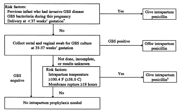 *Estimated in Rouse et al.55 CDC = Centers for Disease Control; ACOG = American College of Obstetricians and Gynecologists; AAP = Association of American Physicians; ROM = rupture of membranes; GBS = group B streptococcus. Identification As mentioned, GBS colonization during pregnancy is not stable. The closer to delivery the GBS culture is performed, the more predictive it will be as to the risk of neonatal exposure at delivery. The culture result, however, needs to be available by the time of labor. Thus, 35 to 37 weeks is advised to perform cultures to identify patients with GBS at term. This approach leaves unscreened those pregnancies that deliver prematurely. The appropriate site to culture is the rectum and vaginal introitus because these sites are most likely to contain GBS.4 The vaginal introital sample should be obtained without a speculum examination, and the same swab can be introduced into the rectum and sent as a single culture. Commercially available selective broth media (SBM broth or Lim broth) should be used. The CDC has provided in detail the technique of culture and the laboratory methods to use.4 High-Risk Group Identification and Strategy The AAP recommended that the following risk factors be identified because of results from the only randomized treatment trial that used risk factors48: labor or ROM occurring at less than 37 weeks' gestation, ROM occurring more than 12 hours before delivery, and maternal temperature greater than 37.5°C.53 In addition, intrapartum antibiotics were advocated for women with GBS-positive pregnancies with a prior neonate with GBS infection and for those with multiple gestations. The ACOG guidelines were slightly different than those developed by the AAP. ACOG did not recommend routine GBS screening at any time during pregnancy. Intrapartum antibiotics were recommended for the following: preterm labor or ROM at less than 37 weeks, ROM lasting 18 hours or longer, fever equal to or greater than 38°C during labor, and a previous neonate with symptomatic GBS infection (Fig. 2).52 This strategy has not been tested for efficacy, and it does not include low-risk pregnancies with GBS at term. GBS-positive pregnancies at term without risk factors are expected to represent approximately 30% of cases of neonatal GBS infection.54 A nonrandomized trial suggested the efficacy of treating all women screened and found positive for GBS.50 Thus, a CDC-appointed committee recommended a combined strategy of (1) treating all unscreened, preterm, high-risk pregnancies (preterm labor or ROM at less than 37 weeks, prior pregnancy with GBS infection, GBS bacteria in the current pregnancy); (2) screening at 35 to 37 weeks; and (3) treating all women in labor who were colonized with GBS at 35 to 37 weeks irrespective of the risk for GBS infection. This strategy has not been subjected to an antibiotic trial, but it is estimated to prevent the greatest number of GBS infections (see Table 4). It also results, however, in the largest percentage of pregnant women receiving antibiotics (see Table 4). Several nuisances exist in this strategy. All high-risk preterm pregnancies regardless of knowledge of GBS status, and all term pregnancies with GBS irrespective of high-risk factors, would be treated. Antibiotic prophylaxis for pregnancy with ROM at less than 37 weeks' gestation, in the absence of labor, could be started and continued until the GBS culture result is known or withheld until the culture result is known to be positive. This, of course, is also an option with the ACOG and AAP strategies, because antibiotics would be given to all women with GBS-positive term pregnancies at greater than 37 weeks who had a fever equal to or greater than 38°C during labor, or ROM lasting more than 18 hours. These three strategies are compared in Table 4.54,55,56 Although strategies differ, the adoption of one of these strategies to prevent early-onset GBS sepsis is advocated,4 preferably the CDC or ACOG strategy because they are estimated to prevent the greatest percentage of neonatal infections. All of these strategies are estimated to be cost-effective. A full discussion of these strategies is provided in the CDC recommendation.4 Women with GBS bacteriuria during pregnancy should be treated at the time of diagnosis, and because these women are usually heavily colonized with GBS, they should also be treated during labor without further screening. Likewise, women who previously delivered an infant with neonatal GBS infection should not be screened for GBS, but should be treated in labor (see Fig. 2; Fig. 3). Unscreened pregnancies or known GBS-positive pregnancies with the major risk factors (see Table 4) should also be treated (see Fig. 2 and Fig. 3). According to the CDC strategy, all pregnancies with a positive GBS culture at 35 to 37 weeks should also be treated at the onset of delivery, regardless of risk factors (see Fig. 3). The recommended antibiotics and doses are listed in Table 5. Penicillin is recommended over ampicillin because it may cause less resistance in other bacteria. Penicillin-allergic patients should receive clindamycin or erythromycin. Patients with fever during labor with an unknown GBS status should receive gentamicin to inhibit Enterobacteriaceae, including E. coli, in addition to a penicillin. TABLE 5 Antibiotic Protocol for Intrapartum GBS Prophylaxis