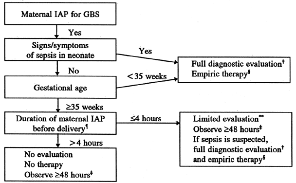 An important aspect of early-onset GBS infection prevention is the administration of antibiotics to premature and symptomatic neonates after delivery. Asymptomatic infants at 35 weeks' gestation or older whose mothers received antibiotic prophylaxis 4 hours before delivery can be observed for 48 hours and not evaluated or treated. If antibiotics were given to the mother 4 hours before delivery, a limited evaluation with a blood count and blood culture and observation for 48 hours would be recommended. Symptomatic neonates with suspected sepsis should receive a full evaluation (blood count, blood culture, chest x-ray, and perhaps a spinal tap) and antibiotic therapy (Fig. 4). A word of caution: this algorithm has not been field tested, because all neonates were treated after delivery in the one randomized antibiotic trial.48