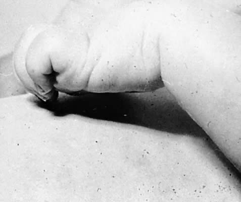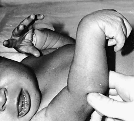 Brachial plexus palsy is a well-known complication of both breech and cephalic injury. Although obstetric trauma is the most common cause of birth-related brachial plexus injury, injuries also occur from intrauterine compression, exostosis of the first rib, neoplasm, and neck compression.10 The incidence of obstetric plexus palsy ranges from 0.19 to 2.6 per 1000 live births.11–14 Predisposing factors include large birth-weight infants with shoulder dystocia, forceps or vacuum assistance, and breech presentation.13–15 Obstetric injury can result from traction of the plexus, root avulsion, or transection of the nerves as they join to form the plexus. Stretch injuries have a good prognosis, whereas those due to avulsion may not recover function. Injury to the upper segments of the brachial plexus, C-5 and C-6, is termed Erb's palsy. The diagnosis is suspected when the arm is held in the characteristic posture of adduction with internal rotation (Fig. 4). This is caused by paralysis of the deltoid, supraspinatus, and infraspinatus. The elbow is extended and the forearm is pronated because of weakness of the biceps and brachioradialis muscles. This results in the “waiter's tip” hand (Fig. 5). Despite the typical hand posture in Erb's palsy, wrist and hand movements are preserved. The bicep stretch reflex is absent, but the triceps reflex is spared.
