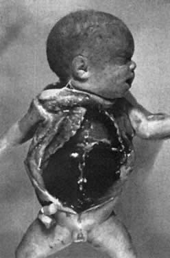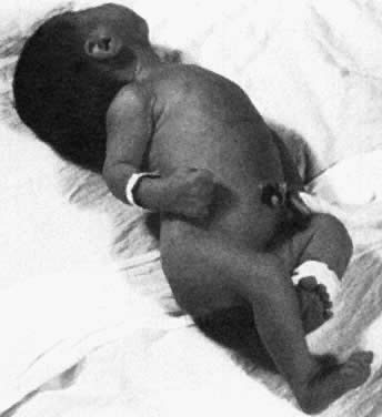 Mild About half of the affected infants are mildly or not anemic at birth (cord hemoglobin exceeds 12 g/dL). They are not dangerously hyperbilirubinemic (cord bilirubin levels are less than 3.5 mg/dL). Their RBCs, however, are coated with anti-D, making them direct antiglobulin (Coombs' test) positive, the hallmark of all types of alloimmune hemolytic disease other than ABO. In these infants, significant anemia (less than 10 g/dL) does not develop, nor does significant hyperbilirubinemia (more than 20 mg/dL in mature infants, 15 mg to 18 mg/dL in premature infants). They require no treatment and survive intact, as they did 60 years ago before the Rh blood group system was known and before any treatment was available. Moderate In about 25% of affected infants, the disease is more severe. Erythropoiesis is adequate to prevent severe anemia but not so great that hepatic hypertrophy and circulatory obstruction occur. The fetus is delivered in good condition at or near term. Before birth, the products of fetal RBC hemolysis are transported across the placenta and metabolized by the mother. After delivery, infants must rely on their own resources to metabolize and excrete the products of RBC destruction. When an RBC is destroyed, globin is split from hemoglobin, leaving the prosthetic pigment heme. Heme is rapidly converted to indirect bilirubin, which is neurotoxic. With increased RBC destruction, there is increased production of indirect bilirubin. At birth, an infant's ability to metabolize indirect bilirubin is severely limited. Infants' livers are deficient in the transport protein Y and the microsomal enzyme uridine diphosphoglucuronyl transferase, which are responsible for the transfer of indirect bilirubin across the liver cell membrane into the cytoplasm and then for the conjugation into water-soluble, nontoxic bilirubin diglucuronide (direct bilirubin), which is then excreted by way of the biliary canaliculi down the bile ducts into the small intestine. Indirect bilirubin is water insoluble and lipid soluble and can circulate only if it is bound to the plasma protein carrier albumin. When the bilirubin-binding sites on albumin are saturated, unbound free indirect bilirubin appears. It cannot remain in a watery medium such as plasma and diffuses into high lipid content tissues. Free indirect bilirubin diffuses across the lipid-containing neuron membrane and interferes with vital metabolic processes, causing ballooning of the neural mitochondria. The neuron dies. Bilirubin accumulates within the dead neurons, producing the characteristic yellow color found at autopsy (kernicterus). Infants who develop bilirubin encephalopathy (kernicterus) are deeply jaundiced. Signs of brain dysfunction appear on the third to the fifth day. They become lethargic and hypertonic, lying in a position of opisthotonos (Fig. 4). Their necks are extended, and their wrists, elbows, and knees are flexed. They are rigid and suck poorly. Their grasp and Moro reflexes disappear, and they may convulse. Apnea develops, and death occurs in 90% of such infants. In the remaining 10% of infants, jaundice lessens, and hypertonicity diminishes. Initially, the neonates appear well. As they grow older, signs of severe neurologic damage inevitably appear. Most are profoundly deaf. Most have cerebral palsy of the spastic choreoathetoid type. Intellectual retardation is variable and may be severe. Even when retardation is mild, learning and functioning are impeded by the severe deafness and abnormal movements produced by the spastic choreoathetosis.