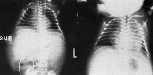 The earlier belief that hydrops was due to hypervolemic heart failure may not be correct. Although treatment measures carried out to keep hydropic neonates alive inevitably precipitate heart failure (Fig. 6), at birth, most hydropic infants are not hypervolemic, nor are they in heart failure.25 Hepatic hypertrophy with portal hypertension and hepatocellular damage is a more likely cause of hydrops fetalis.26 With severe RBC destruction, hepatic erythropoiesis and hepatic enlargement become extreme. Hepatic cords and hepatic circulation are distorted by erythropoietic tissue. Portal and umbilical venous hypertension develops. The placenta becomes thick and edematous; cytotrophoblast persists. Placental perfusion is reduced, and ascites appears. As progressively greater distortion of hepatic cords by islets of erythropoiesis occurs, hepatic circulation and hepatocyte function are reduced. Hypoalbuminemia develops and produces generalized anasarca. Pleural and pericardial effusions appear. Death in utero usually occurs. If a hydropic fetus is born alive, ventilation usually is impossible because of pulmonary edema and compression hypoplasia of the lungs. Although the cause of hydrops fetalis just presented is a theory, it fits the observed facts. It explains the variable degree of fetal anemia noted with Rh hydrops fetalis because the degree of hepatic hypertrophy, portal hypertension, and hepatocellular damage—not anemia—are its basic causes. Although anemia usually is severe, hydrops may occur with hemoglobin levels well above 7 g/dL; conversely, an affected fetus may not be hydropic with hemoglobin levels well below 5 g/dL (in one instance, 2.5 g/dL). |