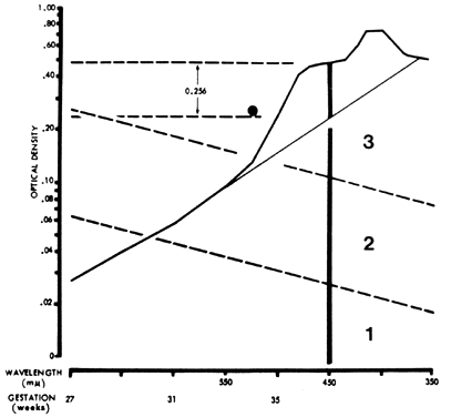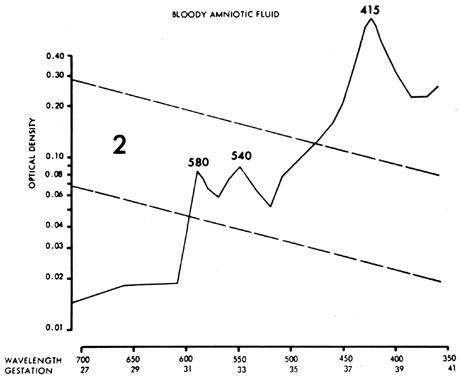 OTHER AMNIOTIC FLUID MEASUREMENTS. Many other methods of measurement of amniotic fluid have been reported, with each author extolling his or her method as an advance in improving accuracy of prediction of Rh disease. As pointed out by Bartsch in 1970,41 none is an improvement over the Liley method. Experience and judgment of the person reviewing the amniotic fluid measurements and predicting the severity of the disease are more important than the method of measurement used. AMNIOCENTESIS. Technique. Because the risk of fetomaternal TPH, with consequent increasing antibody titers and increasing severity of Rh disease, is always present, amniocentesis should be carried out only after careful ultrasound placental localization. If the placenta is on the anterior uterine wall, amniocentesis should be performed under direct real-time ultrasound guidance. The use of ultrasound is of great value in determining the position of a pocket of amniotic fluid and the site and depth of insertion of the needle required to obtain a blood-free sample of amniotic fluid without traversing the placenta. If amniocentesis must be carried out without the use of ultrasound, a suprapubic approach may be less likely to encounter the placenta. Nevertheless, amniocentesis carried out without ultrasound guidance is associated with a 10% to 11% risk of fetomaternal TPH and increased severity of Rh disease.12 Amniocentesis always should be carried out using careful aseptic technique and local anesthesia. A clotted blood sample should be taken before and 5 minutes after amniocentesis. The needle insertion site is determined by palpation and ultrasound examination. The site is prepared with a suitable antiseptic, draped, and infiltrated with a local anesthetic. The operator introduces a lumbar puncture needle (20 or 22 gauge) through the abdominal wall into the uterus to the depth at which ultrasound has indicated a pocket of amniotic fluid. The stylet is removed, and 10 to 15 mL of fluid are aspirated. If fluid cannot be removed, the needle is withdrawn or inserted slightly. Rotation of the needle may aid the flow of fluid. Normally, amniotic fluid is slightly turbid, and turbidity increases as term is approached. Various degrees of yellow coloration are present. The fluid is protected from light and sent for ΔOD 450 measurement. After 31 weeks' gestation, it is also examined for the present of pulmonary maturity (lecithin/sphingomyelin [L:S] ratio of more than 2.0:1, phosphatidylglycerol [PG] of more than 2%). The maternal blood samples are sent for Kleihauer fetal cell screening and for antibody titration. Risks. Maternal risks from amniocentesis are negligible. If the procedure is carried out properly, there should be no risk of infection. Rarely, abruptio placentae or precipitation of labor occurs after amniocentesis. Fetal hazards, although not great, are not inconsequential. Direct trauma from the needle has been reported but is rare.42 The chief hazards—placental trauma, fetomaternal TPH, rising antibody titers, and increased severity of Rh disease—were described previously. Fetal exsanguination, a theoretical hazard, must be rare after amniocentesis. Sources of Error in Amniotic Fluid Diagnosis. Other fetal conditions or contaminants can distort the ΔOD 450 measurement and produce serious errors. Maternal or fetal blood (oxyhemoglobin) causes sharp 580-, 540-, and 415-nm peaks (Fig. 10), which obscure any 450-nm peak and render the fluid valueless. Although smaller amounts of blood, if removed quickly, do not obscure the 450-nm peak, a small amount of plasma (particularly fetal plasma) can cause a spurious increase in the ΔOD 450 measurement, with resultant misinterpretation of severity of Rh disease. Methemalbumin, usually an indicator of severe disease, produces a 405-nm peak that diminishes the ΔOD 450 measurement. Meconium contamination of amniotic fluid markedly distorts the ΔOD 450 measurement, shifting the peak toward 420 nm. Exposure of the fluid to daylight or fluorescent light destroys bilirubin, producing a falsely low ΔOD 450 measurement. Maternal urine or fetal ascitic fluid occasionally is aspirated instead of amniotic fluid. Urine produces no 450-nm peak. Ascitic fluid is clear, bright yellow, and more viscous than amniotic fluid. It appears different from the more turbid, less viscous amniotic fluid. The absorption peak of ascitic fluid is much higher, often requiring dilution before it can be measured. The absorption peak is deviated toward 460 nm. Congenital abnormalities of the fetus, such as anencephaly, open spina bifida, and obstructive lesion of the gastrointestinal tract such as tracheoesophageal fistula and duodenal atresia, produce hydramnios and marked rises in the ΔOD 450 measurement, which may be misleading if the mother is Rh immunized. Despite these potential errors, I believe that amniotic fluid spectrophotometry is an accurate biologic screening test. Life-threatening inaccuracies occurred in only 2.1% of the 1170 women who underwent 3351 amniotic fluid examinations. Criteria and Timing. Because amniocentesis is not without some hazard to the fetus, it should be undertaken only when the history or antibody titer indicates that the fetus is at risk of developing hydrops and dying. Using the history and antibody criteria already outlined as guidelines, only half of Rh-immunized pregnant women require amniocentesis. Amniocentesis should be undertaken at 18 to 19 weeks' gestation, irrespective of the titer, if there is a history of previous stillbirth or an infant who required exchange transfusion. If there is no such history, amniocentesis should be carried out only if there is an antibody titer indicating a risk of hydrops (more than 1:16 in albumin in my institution). If the critical titer is present before 18 weeks, the initial procedure is carried out at 18 to 19 weeks' gestation. If the critical titer is reached after 18 weeks' gestation, amniocentesis should be carri
