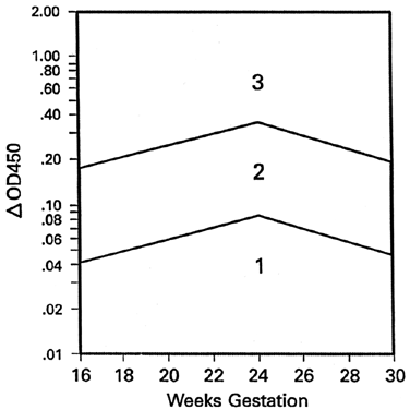 Six parameters can help to assess the degree of severity of hemolytic disease: (1) history of preceding disease, (2) maternal antibody titers, (3) cell-mediated maternal antibody functional assays, (4) amniotic fluid spectrophotometric measurements, (5) ultrasonographic assessment, and (6) direct fetal blood sampling. History of Preceding Disease Two common patterns of severity of erythroblastosis fetalis are seen. The degree of severity of disease may remain unchanged in subsequent pregnancies or become progressively worse. On rare occasions, it may become less severe. Once a pattern of mild or moderate disease is established, it tends to remain. Hydrops, however, may occur after several mildly or moderately affected infants result from preceding pregnancies. The pattern of subsequent Rh disease may depend greatly on the size and frequency of further Rh-positive fetomaternal RBC TPH in the succeeding pregnancy. Significant fetomaternal TPH occurs in 75% of pregnant women. After one hydropic birth, there is a 90% likelihood that the next affected fetus will also become hydropic. History is not helpful in the first affected pregnancy, wherein 8% to 10% of fetuses become hydropic before term. It is of little value when there is a history of hydrops but the father is heterozygous for D. Also, prior history of hydrops does not indicate when in the next pregnancy the fetus will become hydropic, although as a general rule, hydrops develops at the same time or earlier in gestation. Methods of treating the fetus destined to become hydropic before 32 to 34 weeks' gestation (fetal transfusions) are different from the methods used in treating fetuses destined to become hydropic after 34 weeks' gestation (early delivery). Maternal Antibody Titration Despite some beliefs to the contrary, Rh-antibody measurements, carried out by the same experienced technologists using the same methods and the same test cells, are of help in predicting the severity of erythroblastosis. Because other factors vary, such as the Rh-antibody–binding constant, the amount of D antigen on the RBC membrane, and the ability of the fetus to maintain a reasonable circulating RBC hemoglobin without compromising hepatocellular function and umbilical portal venous circulation, Rh-antibody titrations predict only the fetus at risk. They do not predict the severity of erythroblastosis with such accuracy that treatment measures may be undertaken on the basis of antibody titrations alone. Methods of titration vary from laboratory to laboratory. The Rh-antibody titer that puts a fetus at risk of developing hydrops must be determined for each laboratory (in the Winnipeg Rh Laboratory, the significant titer is 1:16 in albumin, which puts the fetus at a 10% risk of becoming hydropic before term). Indirect antiglobulin titer is used by many laboratories. It is more sensitive (usually positive one to three dilutions higher) than albumin titers. The indirect antiglobulin titer that puts the fetus at risk may be 1:32 to 1:64 but must be determined individually for each laboratory. Antibody titers are of little help if there is a history of severe erythroblastosis but the father is heterozygous for D. Only rarely does the antibody titer rise, indicating an affected fetus. More commonly, the titer does not change, and the Rh status (Rh-positive and severely affected or Rh-negative and unaffected) of the fetus is not known. This problem has now been solved, as is outlined later. Because the antibody titer is the basis for selecting the mother and her fetus who are at risk and require further investigation, regular antibody titrations must be carried out during pregnancy. The first titration should be made on a blood sample obtained at a patient's first prenatal visit. Subsequent titrations should be made at 18 weeks, at 20 to 22 weeks, and every 2 weeks thereafter. Antibody measurement and history of severity of prior Rh disease together are insufficient to allow proper management of an Rh-immunized woman and her affected fetus. At the Winnipeg General Hospital, in an 8-year period from 1954 to 1961 in which 426 Rh-immunized pregnancies were managed, there were 67 perinatal deaths from erythroblastosis and 54 infants who survived only because they were delivered early (as early as 32 weeks' gestation).27 In just 62% of the 121 most severely affected fetuses was severity of erythroblastosis predicted accurately on the basis of history and antibody titer. If more accurate prediction of severity had been possible, half of the 67 deaths might have been prevented by treatment measures available at that time. Cell-Mediated Maternal Antibody Functional Assays Because of the relatively poor correlation between antibody titrations and severity of hemolytic disease, various assays have been developed that reflect the binding constant or avidity of the antibody for the antigen on the RBC membrane and therefore its ability to produce severe hemolysis. These assays include the monocyte monolayer assay28,29 and the antibody-dependent cellular cytotoxicity (ADCC) test using lymphocytes,30 monocytes,31 and monocyte chemiluminescence.32 Each one of these assays has its advocates. Three recent papers have compared the functional assays. Hadley and colleagues33 compared monocyte chemiluminescence, K-cell lymphocytes ADCC, monocyte-macrophage ADCC, and a rosette assay using U937 cells. They determined that monocyte-based (i.e., monocyte chemiluminescence and monocyte ADCC) functional assays predicted severity of disease better than lymphocyte-based assays (U937 cells and K-lymphocyte ADCC). Zupanska and co-workers28 reported that a monocyte-based assay correlated better with clinical severity of hemolytic disease than did rosette assays using lymphocytes. Mollison34 reported on a survey of nine European laboratories using functional assays to test sera from mothers delivering babies with varying degrees of hemolytic disease. Correct test results were as follows: AD