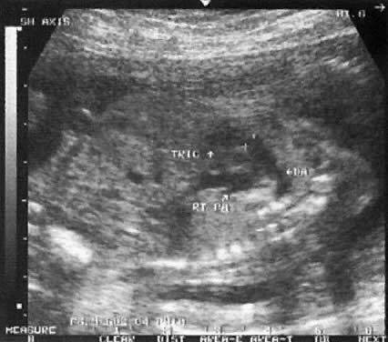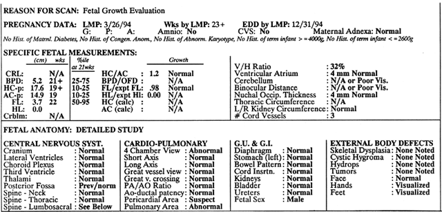 FL, Femur length; O, observed; E, expected (mean) Note: The finding of short femoral and humeral lengths, relative to expected values (see Table 5), would adjust a triple screen risk for Down syndrome from 1 : 2000 to 1 : 175. This adjustment suggests that further testing to assess fetal karyotype would now be warranted. (Adapted from Vintzileos AM, Egan JFX: Adjusting the risk for trisomy 21 on the basis of second trimester ultrasonography. Am J Obstet Gynecol 172:837, 1995) TIFFA examinations entail ultrasonic visualization of at least 34 fetal views and measurement of seven specific sites (Fig. 1). For each of these views, the ultrasonographer should indicate whether the structure is normal, previously normal, not applicable, suspect, abnormal, or poorly visualized. Poor visualization occurs when (1) fetal movement or position does not allow adequate imaging of a specific area, or (2) gestational age is less than 19 to 20 weeks. A normal TIFFA scan takes approximately 1 hour to complete. However, the presence of an anomaly is likely to extend the study and make it necessary for the mother to undergo a combination of genetic counseling, amniocentesis, or chorionic villi sampling to define fetal karyotype. Studies that definitively resolve any possible concern regarding the long-term safety of ultrasound as well as its cost:benefit analysis are not yet available.6 Ewigman and co-workers7 evaluated the efficacy of routine antenatal diagnostic imaging with ultrasound (RADIUS) in reducing adverse perinatal outcome. Secondary outcomes included maternal morbidity and diagnostic accuracy of ultrasound. Study subjects were recruited from 92 obstetric and 17 family medicine practices in six states. Selection was based on predefined entry criteria that placed all study patients (screened group) in a low-risk category. Ultrasound screening examinations were performed on 7812 study subjects during two pregnancy intervals: 15 to 22 weeks, and 31 to 35 weeks. The women (n = 7718) in the control group had an ultrasound examination performed only if it was clinically indicated. The sensitivity in the detection of congenital anomalies was significantly higher in the screened versus control groups (34.8% vs 11%, p < 0.01); however, the higher detection of anomalies did not result in improved perinatal outcome. Romero8 and others9, 10 attribute the lack of improvement in perinatal outcome to (1) the limited sensitivity in the detection of anomalies in the RADIUS study, and (2) the low rate of pregnancy termination in women diagnosed with a fetal anomaly. The low sensitivity (16.6%) in the detection of anomalies in the RADIUS study, particularly before 24 weeks' gestation, is very disturbing because it does not represent the current diagnostic capability of ultrasound. Specifically, in four studies11, 12, 13, 14 published from 1990 to 1992, the sensitivity of ultrasound screening for congenital anomalies before 24 weeks' gestation was 40%, 60.7%, 74.4%, and 84.3%, respectively. The specificity and negative predictive values were greater than 98%.11,12, 13, 14 Except for the Helsinki trial,11 the positive predictive values in these studies were equal to or greater than 98%.12, 13, 14 | |||||||||||||||||||||||||||||||||||||||||||||||||||||||||||||||||||||||||||||||||||||||||||||||||||||||||||||||||||||||||||||||||||||||||||||||||||||||||||||||||||||||||||||||||||||||||||||||||||||||||||||||||||||||||||||||||||||||||||||||||||||||||||||||||||||||||||||||||||||||||||||||||||||||||||||||||||||||||||||||||||||||||||||||||||||||||||||||||||||||||||||||||||||||||||||||||||||||||||||||||||||||||||||||||||||||||||||||||||||||||||||||||||||||||||||||||||||||||||||||||||||||||||||||||||||||||||||||||||||||||||||||||||||||||||||||||||||||||||||||||||||||||||||||||||||||||||||||||||||||||||||||||||||||||||||||||||||||||||||||||||||||||||||||||||||||||||||||||||||||||||||||||||||||||||||||||||||||||||||||||||||||||||||||||||||||||||||||||||||||||||||||||||||||||||||||||||||||||||||||||||||||||||||||||||||||||||||||||||||||||||||||||||||||||||||||||||||||||||||||||||||||||||||||||||||||||||||||||||||||||||||||||||||||||||||||||||||||||||||||||||||||||||||||||||||||||||||||||||||||