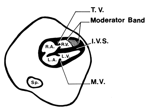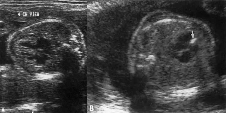 The ultrasonographer should obtain a number of views of the four chambers to gain adequate visualization of all these structures (Fig. 3). THE VENTRICLES. Although both ventricles should be similar in thickness and size, the right ventricle is normally characterized by the appearance of the moderator band, which consists of thickened trabeculae extending from the septum to the parietal wall of the right ventricle (see Fig. 3A). Absence of the moderator band from its normal location implies corrected or L-transposition of the great arteries. In this abnormality, the right ventricle functions as the left chamber, assuming the role of pumping blood into the aorta. Thus, in contrast to D-transposition, L-transposition allows blood flow to the lungs and body to be maintained normally. Hyperechogenicity or thickness of the ventricular walls or ventricular septum, or both, is consistent with cardiomyopathy (Fig. 4). In dextroversion, the apex of the heart points to the right side of the chest. The main differential diagnoses of this condition are cystic adenomatoid malformation of the lungs, diaphragmatic hernia, and polysplenia. In levoversion the apex of the heart points to left side of the chest excessively; the main differential diagnosis of this condition includes left pulmonary hypoplasia and a right-sided pulmonary mass. THE INTERVENTRICULAR SEPTUM. Defects in the IVS constitute the most common form of congenital heart disease and can occur in various locations within the septum. Ultrasonic visualization of small ventricular septal defects, regardless of location, may not be possible in the four-chamber plane. For example, membranous or perimembranous defects (located adjacent to the aortic valve) are situated below the anterior portion of the IVS and are not visualized in the four-chamber plane (Fig. 5). Such defects usually are depicted in the parasagittal plane (Fig. 6). THE ATRIOVENTRICULAR VALVES. The septal insertion of the tricuspid valve should be visualized slightly below that of the mitral valve (see Fig. 2 and Fig. 3). If the insertion is lower, Ebstein anomaly should be considered. Interestingly, hyperechogenicity limited to the area of the mitral valve is usually inconsequential; that is, cardiomyopathy is not a consideration. THE SEPTUM PRIMUM AND SECUNDUM. The foramen ovale is the opening between both atrial septi, allowing blood to flow from the right atrium to the left. In endocardial cushion defect, a single common atrioventricular valve is noted superior to a large ventricular septal defect. Diagnostic Utility of the Four-Chamber View Because the four-chamber view depicts so many cardiac structures and is also the plane used to evaluate cardiac arrhythmia, it is included in all obstetric studies. Copel and associates19 showed that 92% of cardiac defects may be discovered by some abnormality in the four-chamber view and proposed routine screening for CHD. After including the four-chamber view in their examinations, Vergani and colleagues20 improved their CHD diagnosis sensitivity from 43% to 81%. Subsequently, Sharland and Allan21 showed that after routinely including the four-chamber view in obstetric studies, 53 fetuses were referred for possible CHD over a period of 32 months; previously, from 1980 to 1988, only 8 fetuses had been referred. They reported a 77% sensitivity for the four-chamber view in the diagnosis of CHD. Studies by Bromley and co-workers22 and Wigton and associates,23 however, suggest that the sensitivity of the four-chamber view in detecting CHD is even lower, ranging from 69% to 39%, respectively. This is understandable because the four-chamber view does not allow for assessment of the pulmonary and aortic arteries-outflow tracts that are evaluated best in the parasagittal, short axis, and great vessel views. Parasagital View The parasagittal view encompasses the left ventricle. aortic outflow, a portion of the right ventricle, and the left atrium (see Fig. 6). This plane is significant for two main reasons: