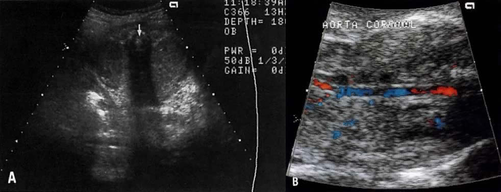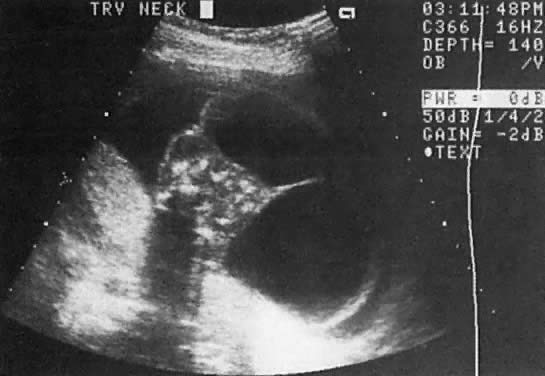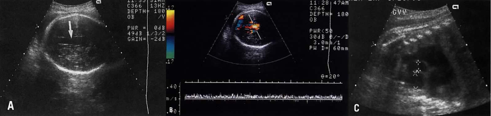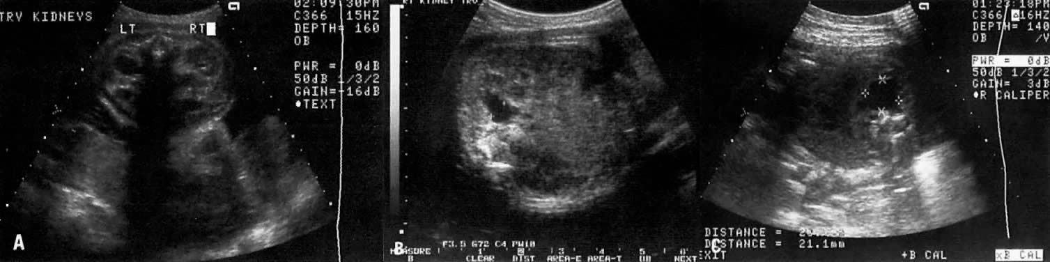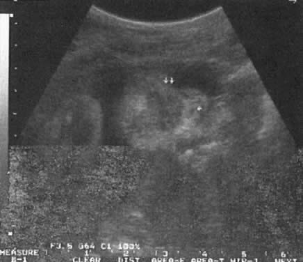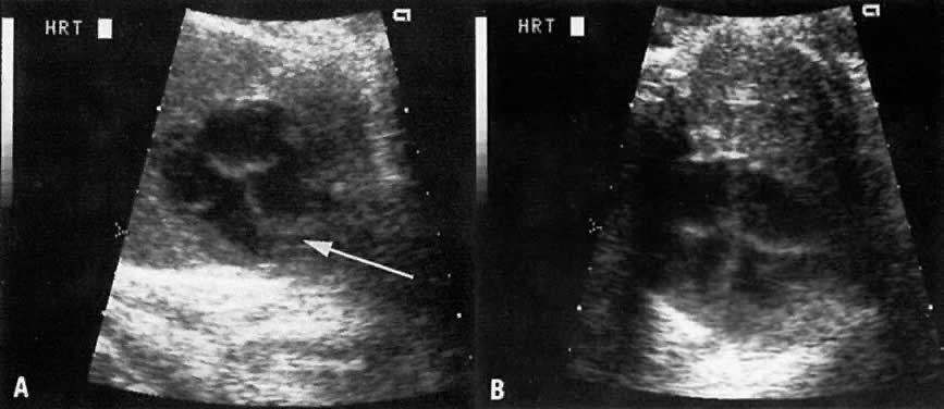 To prevent pulmonary hypoplasia, treatment should be initiated by the 20th pregnancy week, Although early treatment may prevent development of pulmonary hypoplasia, however, 30% to 50% of these children may subsequently develop dysplastic kidneys and require renal transplantation.44 Prune-Belly Syndrome In prune-belly syndrome, the bladder is dilated, the abdominal wall lax, and testicles undescended (cryptorchidism). Although this condition may result from a PUV, it is also believed that it may represent a primary mesoderm defect in the abdominal wall and urinary tract muscles.45 Fortunately in most cases of PUV the urethral obstruction is incomplete, allowing for fetal urination and maintenance of near-normal amniotic fluid volume. The Ureteropelvic Junction Dilation of the UPJ (Fig. 14) results from (1) abnormal recanalization of the upper part of the ureter, resulting in varying degrees of obstruction; or (2) absence of the longitudinal muscle fibers in the upper ureter and renal pelvis. In the latter dysfunction, there is abnormal forward propulsion of urine, resulting in a dilation of the UPJ.46 Importantly, dilation of the UPJ may be associated with other anomalies involving the fetal cardiac, gastrointestinal, and central nervous systems. Further, male fetuses are more frequently affected than female (5:1). The UPJ dilation also occurs more frequently on the left side and can be unilateral in 70% of cases. Pyelectasis The etiology of a dilated renal pelvis or pyelectasis is similar to that of a dilated UPJ. Reflux occurring at the level of the vesicoureteral valves also may result in pyelectasis (Fig. 15). The definition of mild or minimal pyelectasis in the literature is confusing.47 Further, the outcome of fetuses with minimal pyelectasis is not all “benign” as suggested in some studies.48 In fact, many such fetuses may require subsequent medical or surgical intervention. Thus, an anteroposterior diameter equal to or greater than 4 mm or 7 mm before and after 33 weeks' gestation, respectively, warrants postnatal follow-up.48 Moreover., approximately 3.3% of fetuses with pyelectasis in the range of 3 to 5 mm may also have chromosomal abnormalities, including Down syndrome.49, 50 Interestingly, 25% of fetuses with Down syndrome have pyelectasis, whereas only 2.8% of fetuses with a normal karyotype show this condition.49 Hydronephrosis Dilation of the renal calyceal system results from abnormalities at a lower level of the urinary tract. It is differentiated from multicystic dysplastic disease by (1) ultrasonic visualization of radially placed calyces communicating with the renal pelvis and (2) preservation of some renocortical tissue (Fig. 16). In utero diagnosis of pyelectasis, UPJ dilation, and hydronephrosis is significant because it identifies fetuses who will require postnatal urologic evaluation. As a result, early surgical intervention or medical treatment with antibiotics will prevent irreversible renal compromise. Renal Agenesis The frequency of this condition is 1:4000 births, and the risk of recurrence is 3%.51 The etiology is variable and may include chromosomal or genetic disorders (recessive or dominant mode of inheritance). It may also be part of the VATER association: vertebral defects, anal atresia, tracheoesophageal fistula, and radial and renal dysplasia. The outcome of fetuses with renal agenesis is poor because of oligohydramnios and associated pulmonary hypoplasia. Intravenous administration of furosemide (40 mg IV) has not been helpful in differentiating renal agenesis from severe intrauterine growth restriction. Further, because of associated oligohydramnios as well as an enlarged adrenal gland that mimics renal appearance, the diagnosis by gray scale ultrasound is difficult (sensitivity, 50%).51 In suspected cases, however, the use of color Doppler velocimetry may show absence of renal arteries in bilateral renal agenesis and only one renal artery in the unilateral form of this abnormality (Fig. 17).52 Infantile Polycystic Kidney Disease This is an autosomal recessive disorder. The kidneys are enlarged (ratio of kidney:abdominal circumference greater than the norm of 30%) and show small multicystic echoes.53 Unfortunately, the diagnosis cannot always be made before 24 weeks' gestation54 because several subtypes of infantile polycystic kidney disease exist, and these vary in onset and severity. Multicystic-Dysplastic Kidney Disease The etiology of this condition may be secondary to a chromosomal abnormality or a mutant gene. It is rare, occurring at a rate of 1:10,000 births, and has a male-to-female ratio of 2:1. The condition is unilateral in 75% of cases. The etiology is related to either (1) poor induction of nephron formation or (2) obstructive uropathy. Defects in nephron formation occur early in embryogenesis, thus impeding renal development. In such cases, the kidneys are very small, each weighing as little as 1 g, and cysts are evident only via microscopic examination. This defect is classified as Potter type II-B dysplastic kidney.55 If the defect develops by 9 to 13 postmenstrual weeks, the fetal kidney assumes a large multicystic appearance (Potter type II-A; Fig. 18). Megacystis-microcolon-intestinal hypoperistalsis (MMIH) syndrome is a fatal autosomal recessive disorder believed to result from an end-organ receptor defect confined to the smooth muscle of the urinary and gastrointestinal tracts.56, 57, 58, 59 It is characterized by a large, thick-walled bladder plus dilation and distention of the small bowel, including the duodenum.57, 58 The kidneys may also appear hydronephrotic or even multicystic. Amniotic fluid volume may be either normal or excessive. The condition is differentiated from PUV by the absence of oligohydramnios and dilation of the proximal urethra. This entity has been described only recently, so it is not clear whether diagnosis by ultrasound is always possible before 24 weeks' gestation. |