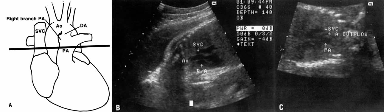 Short Axis View The short axis view (Fig. 7) encompasses the aortic and pulmonary valves as well as the ductus arteriosus and the right branch of the pulmonary artery. It is used to evaluate the size of the aorta and pulmonary arteries at the valvular level. Great Vessel View The great vessel view depicts the relatively parallel relationship of the superior vena cava, aorta, and pulmonary arteries after the latter two cross each other (Fig. 8). Clear visualization of this plane indicates that the crossing of the aorta and pulmonary artery is normal and virtually rules out transposition of the great vessels. Aortic or pulmonary stenosis also can be recognized in this view.