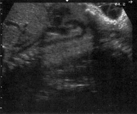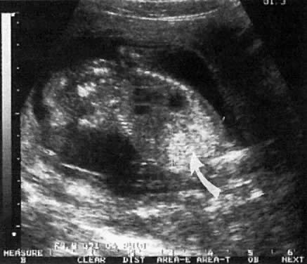 Although high-resolution equipment has enabled lung tissue to be visualized adjacent to the heart, most studies dealing with antenatal diagnosis of pulmonary hypoplasia have focused on reduced chest size as a predictor for the condition.29, 30 More recently, Vintzileos and colleagues31 showed that the highest sensitivity (85%) and positive predictive value (83%) for the diagnosis of pulmonary hypoplasia could be obtained with the following ratio: [chest area - heart area/chest area] × 100 The chest area should be traced at the midpoint of the chest wall. The ratio is independent of gestational age and is considered abnormal when it is less than or equal to 62 (5th percentile). The ratio can be used when the abdominal circumference is large (as in ascites or obstructive uropathy) or small (as in omphalocele). It is not applicable to fetuses with diaphragmatic hernia because chest size is artificially enlarged in this condition. Diaphragmatic Hernia Congenital defects in the diaphragm result in herniation of bowel, stomach, and possibly parts of the liver and pancreas, into the chest. The hernia displaces the heart and mediastinum, making antenatal diagnosis possible. The most common defect (1:3000 births) involves the foramen of Bochdalek, which is situated in the posterolateral aspect of the diaphragm.32 This condition may be associated with cardiac abnormalities or aneuploidy (trisomy 13, 18, and 21). In utero corrective surgery is possible in cases of isolated diaphragmatic hernia. The outcome of open in utero surgery, however, should be weighed against that of extracorporeal oxygen membrane oxygenation in the neonate, which has been reported to carry a success rate of only 55%. Data on this subject are still evolving.33 Another rare type of diaphragmatic hernia is found through the foramen of Morgagni. This hernia is associated with a poor prognosis because of its association with other anomalies, such as hydrocephalus, encephalocele, enlarged cisterna magna, malrotation of the gut, cardiac anomalies, and trisomies.32 The differential diagnosis of diaphragmatic hernia includes (1) eventration or displacement of visceral contents into the chest secondary to a thin diaphragm; (2) chest mass; and (3) pulmonary tumor. Ventral Wall Defects Fetal bowel normally is located outside the abdomen in the first trimester of pregnancy. This is known as physiologic herniation, a condition that can be appreciated with the use of high-frequency vaginal transducers.34, 35 Thus, the diagnosis of omphalocele should not be made before the 14th week of pregnancy. True ventral wall defects occur at a rate of 1:2500 births. Two main forms are described: omphalocele and gastroschisis. In omphalocele, the fetal gut (and sometimes the liver) is outside the abdomen but is covered by a sac-like cyst interface (Fig. 11). In gastroschisis, segments of intestine are noted in the peritoneal cavity without any sac-like cover. In contrast to omphalocele, the umbilical cord in gastroschisis is inserted into the abdominal wall (see Fig. 11). Gastroschisis is not associated with other fetal abnormalities, but a chromosomal abnormality may be found in approximately 50% of fetuses with omphalocele, particularly if fetal liver is not part of the hernia.36, 37 Other anomalies involving the cardiac, skeletal, renal, and central nervous systems may also be present. The Beckwith-Weidman syndrome of organomegaly and hypoglycemia has been described in association with omphalocele. In the presence of a ventral wall defect, the mode of delivery (vaginal delivery vs cesarean section) remains controversial.38, 39 Vaginal delivery appears safe, however, when the hernia is small and the liver is not herniated. Obstructive Gastrointestinal Lesions and Hyperechogenic Bowel Duodenal atresia results from failure of recanalization of the upper gastrointestinal tract at 8 weeks' gestation. It may be associated with Down syndrome and other anomalies involving the gastrointestinal. cardiac, and renal systems. This condition is characterized by dilation of the stomach and proximal part of the duodenum (double-bubble sign). Occasionally the diagnosis can be made before the 20th week of pregnancy, but it is more likely to be made after the 20th week, when the quantity of swallowed amniotic fluid exceeds the resorptive capacity of the gut.40 Small bowel obstruction results from in utero avascular necrosis of segments of jejunum and ileum. Dilation of small bowel proximal to the necrotic segments is ultrasonically recognizable by the presence of valvular flaps projecting into the lumen. The pattern of bowel dilation in other obstructive bowel abnormalities is not specific enough to allow for a precise diagnosis. These abnormalities include malrotation of the bowel, volvulus, intussusception, and Hirschprung disease (congenital intestinal aganglionosis). Meconium within normal bowel sometimes appears bright and has been described as hyperechogenic bowel (Fig. 12). In many fetuses that exhibit this entity, the outcome may be norma141; however, it has been associated with cystic fibrosis and aneuploidy.42 Prospective couples should be counseled regarding appropriate antenatal testing. Differentiation between hyperechogenic bowel and meconium peritonitis may be possible. In the latter condition, bowel perforation results in extravasation of meconium into the abdominal cavity. Meconium induces an inflammatory response, formation of adhesions, and calcium deposition in the area. |