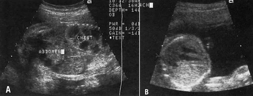 Esophageal Atresia This is a very rare anomaly occurring at a rate of 1:25,000 births. In 10% of cases it can be characterized ultrasonographically by a dilated proximal esophagus, absence of stomach echo, and polyhydramnios.25 In the remaining 90% of cases, however, the defect cannot be ultrasonically recognized because of abnormal communication channels between the proximal aspects of the esophagus, trachea, and stomach, which result in free flow of amniotic fluid. Pulmonary Cystic Adenomatoid Malformation Three types of pulmonary cystic adenomatoid malformation have been characterized26: Type I: The cysts are large ( Type III: The lesion is microcystic, brightly echogenic, and large, and its presence is associated with a poor prognosis (see Fig. 10). A pulmonary cystic adenomatoid malformation can result in a right or left shift of the mediastinum (see Fig. 10). The differential diagnosis includes pulmonary sequestration and diaphragmatic hernia.27 Pulmonary Hypoplasia Pulmonary hypoplasia is associated with a high mortality rate. Lung weight