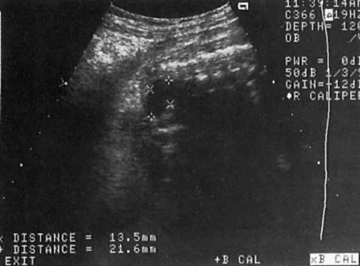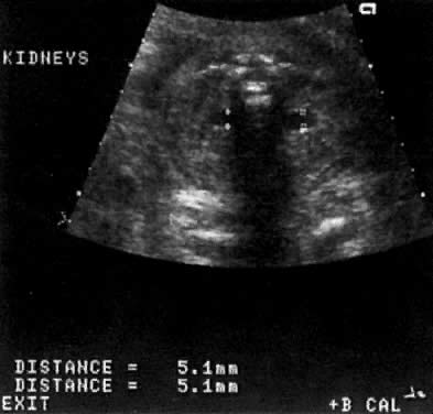 The frequency of urinary abnormalities is approximately 7:1000 newborns, and the recurrence risk is 8% to 10%. The etiology of urinary tract abnormalities should extend beyond the apparent site of the lesion. For example, dilation of the ureteropelvic junction (UPJ) may result either from obstruction at the upper ureter or from pathology at a more caudad level. This includes increased intraluminal pressure secondary to reflux at the level of the vesicoureteral junction resulting in dilation of the UPJ. Similarly, a posterior urethral valve (PUV) will dilate the UPJ and even produce hydronephrosis. Thus, in discussing urinary tract abnormalities, it is reasonable to start with the urethra and proceed cephalad. Posterior Urethral Valve Most PUVs are partial, such that the resulting bladder dilation is not severe. The ureters may only be slightly dilated, and if present, hydronephrosis is moderate (Fig. 13). In the severe form, however, the pathophysiology is severe and may resemble the findings in agenesis of the urethra. In complete PUV, the bladder is markedly dilated. The ureters also are convoluted and large. Hydronephrosis is severe. Oligohydramnios prevents appropriate pulmonary development and leads to pulmonary hypoplasia. Early treatment of this condition (less than 20 weeks' gestation) is important to prevent permanent renal damage. The indications for therapy include the following: