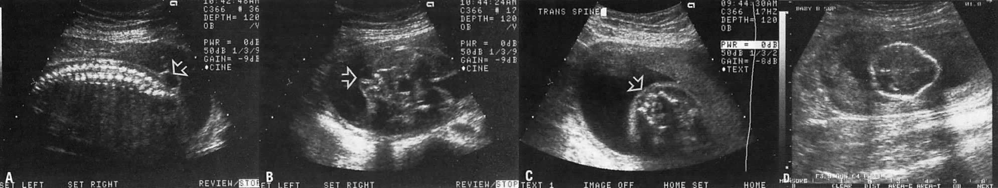 *Percentages are shown in parentheses. Study included 150 low-risk pregnancies and utilized Acuson equipment and a 5-MHz transducer. (Adapted from Johnson P, Sharland G. Maxwell D, Allan L: The role of transvaginal sonography in the early detection of congenital heart disease. Ultrasound Obstet Gynecol 2:2481, 1992). TABLE 2. Sequential Appearance of Fetal Neural Structures During the First