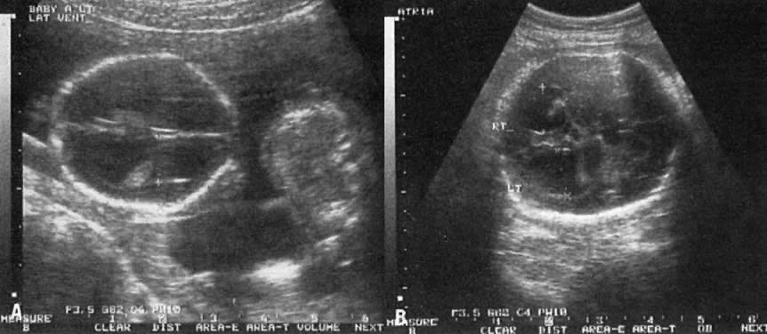 Spina bifida is frequently associated with meningocele. The latter represents extrusion of the meninges through the bony defect. Some cerebrospinal fluid (CSF) is usually contained within the meningocele. As a result, the area appears cystic, an ultrasound characteristic that enhances visibility of small spina bifida (Fig. 21). Hydrocephaly Figure 22 depicts the flow of CSF in hydrocephaly. Any lesion preventing normal flow of CSF from the lateral ventricles to the cisterns results in hydrocephaly. Obstruction at the level of the aqueduct of Sylvius results in enlargement of the third and lateral ventricles (Fig. 23). The etiology of such obstruction includes (1) X-linked recessive inheritance, (2) infection with cytomegalovirus or toxoplasmosis, and (3) other lesions that impinge on the area. Hydrocephaly plus dilation of the posterior fossa results from obstruction of CSF flow at the level of the foramina Luschka and Magendie (see Dandy-Walker syndrome, below). Table 15 lists a number of other specific syndromes that result in hydrocephaly. Apert's syndrome In approximately 25% of hydrocephalic fetuses, an abnormal karyotype is found. Of these fetuses, approximately 85%, have additional anomalies. Thus, the prognosis should be individualized depending on specific etiology, but this cannot always be determined antenatally. Hydrocephalic fetuses should not be delivered before pulmonary maturity is attained because there is a weak correlation between the extent of compression of the cerebral cortex and the severity of mental retardation. ROUTE OF DELIVERY. In a term fetus with normal chromosomes, isolated hydrocephalus (i..e, no other abnormality noted), and head circumference less than 90th percentile, vaginal delivery may be a reasonable option. If head circumference is equal to or greater than 90th percentile at term, cesarean section may be the least traumatic route. When hydrocephalus is associated with conditions incompatible with life, such as renal agenesis, thanatophoric dwarfism, or trisomy 18, cephalocentesis may be used to accomplish vaginal delivery. The combination of hydrocephalus with spina bifida also can determine the mode of delivery (see section on Spina Bifida. below). In contrast to simple ventriculomegaly, hydrocephalus usually is more progressive, and it is frequently associated with compression of the choroid plexus (see Fig. 23). The progression of hydrocephalus may be gauged by (1) the ventricular:hemispheric ratio, and (2) the diameter of the ventricular atrium (see Fig. 22 and Fig. 23).66, ,68 Dilation of the ventricular atrium is also a characteristic finding in agenesis of the corpus callosum. In such cases, the third ventricle is displaced cephalad and the frontal horns laterally.69 DIFFERENTIAL DIAGNOSES. Differential diagnoses of hydrocephaly include the following: