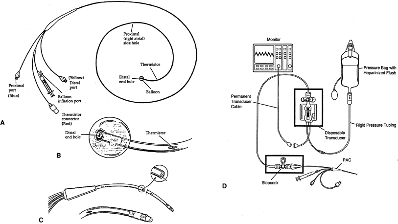 Hemodynamic evaluation of the critically ill patient requires full understanding of cardiovascular structure and function. History taking and physical examination should be carried out efficiently, yet thoroughly. Assessment of maternal vital signs, mental status, urine output, and documentation of fetal well-being provides very important evidence of adequacy of circulation and represents the reference to which patient deterioration or effects of treatment will be compared. When rapid deterioration of cardiovascular status occurs, however, reliance on traditional clinical parameters may not allow for timely intervention. Reliable, continuous information may require the use of invasive monitoring, such as an arterial line (intravascular mean arterial pressure), and/or a pulmonary artery catheter (cardiac output and pulmonary arterial and wedge pressures). Arterial Line Blood pressure can be determined, in decreasing order of reliability, by intravascular catheters, digital oscillometers, and sphygmomanometers. Direct recording of intravascular pressure is recommended for all patients in the intensive care unit who require careful continuous monitoring of arterial pressure.18 Fluid-filled tubing transmits the pressure wave from the cannulated artery to the pressure transducer. Systolic, diastolic, and mean arterial pressures are measured. Mean arterial pressure (MAP) represents the driving pressure to the peripheral organs, and it can be either calculated (MAP = diastolic pressure + 1/3 pulse pressure) or measured by integrating the area under the arterial pressure waveform. The latter method is independent of heart rate and the assumption that diastole represents two thirds of the cardiac cycle.18 Some indications for arterial line placement may include: expectation of hemodynamic instability regardless of etiology; need for continuous blood pressure measurement when using vasoactive drugs (e.g., dopamine, nitroprusside); respiratory insufficiency; intubation for more than 4 to 6 hours; and the need for frequent arterial blood sampling. Some anesthesiologists recommend arterial line placement in situations in which the potential for rapid decrease in blood pressure exists. It has also has been recommended for morbidly obese patients for whom appropriate size cuffs are not available. Cannulation of the radial artery must be preceded by evaluation of arterial supply to the hand by the Allen test.19 Palpate the radial and ulnar pulses. Ask the patient to make a tight fist with her hand in supine position. Occlude both radial and ulnar arteries with your thumbs. Ask the patient to open and close her hand multiple times (this will make the palm pale). Then release your thumb from one of the arteries. The palm should flush in no more than 5 seconds. Persisting pallor of the palm indicates insufficiency or occlusion of the released artery. Repeat the same procedure and test the other artery. Local anesthesia should be used, as it will both decrease the patient's pain and increase your success rate. Thrombosis, infection, bleeding, vascular or nerve trauma, and accidental injection of intravenous drugs are potential complications. Pulmonary Artery Catheter The pulmonary artery catheter (PAC), often called the Swan-Ganz catheter, is a triple lumen, flow-directed, balloon-tipped, thermodilution catheter (Fig. 1). The catheter's length ranges from 60 to 110 cm and is 2.3 mm (7 Fr) in outside diameter. The standard catheter has 3 ports (a proximal infusion port, a distal infusion port, and a balloon inflation port) and the thermistor connector in its proximal end. The catheter's shaft is mainly made of a polyvinyl chloride derivative and is radiopaque. The proximal infusion port exits 30 cm from the tip of catheter and after correct insertion should be located in the patient's right atria. This port is used to infuse fluids or medications, and when connected to a transducer with a heparinized line, it is used to continuously monitor the right atrial pressure (RAP), which is equivalent to the central venous pressure (CVP). The distal infusion port exits at the tip of the catheter, and after correct insertion, it should rest in a branch of the patient's pulmonary artery. This port is connected to a transducer with a heparinized pressure line (continuous flush of 3 mL per hour of heparinized solution in a bag at a pressure of 300 mmHg) to maintain the lumen patent and continuously monitor the pulmonary artery pressure (PAP) when the balloon is deflated, and intermittently the pulmonary capillary wedge pressure (PCWP) when the balloon is inflated. Both the proximal and the distal lumina of the catheter may be used to withdraw samples of venous blood for laboratory studies. The lumen of the balloon's inflation port ends in small latex balloon, located 0.5 cm from the catheter's tip. The balloon is inflated at the time of catheter advancement and when PCWP is needed. The fully inflated balloon (1.5 mL) creates a recess for the tip, preventing the tip from perforating vessels, valves, or chambers as the catheter is advanced.18 While floating the catheter, there is no limit to the duration of inflation; however, once wedged, it should generally not remain inflated for more than 1 minute. The thermistor is a temperature sensor and transducer, located in the outer surface at 4 cm from the catheter's tip that can be attached to a thermodilution cardiac output computer. When cardiac output measurement is desired, 10 mL of injectate (usually normal saline at room temperature or a known cold temperature) is infused into the proximal port. The thermistor will determine the blood's temperature at the tip of the catheter before and after the injectate infusion, and the computer will calculate the cardiac output. Conventional PAC measure pressure and flow is appropriate for assessment of left ventricular function, but right ventricular function, which is more dependent on volume than pressure, is not assessed.20 The s