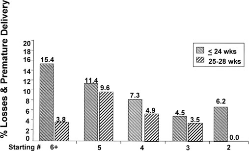Several centers with the world’s largest experience with MFPR have collaborated to leverage the power of their data. In 1993, the first collaborative report showed a 16% pregnancy loss rate through 24 completed weeks.12 This rate was a major improvement compared with expectations of higher order multiple pregnancies, particularly of quadruplets and more. In 1994, 1996, and 2001, multicenter reports showed continued dramatic improvements in the overall outcomes of such pregnancies (Table 3).13,14,15 The 2001 collaborative data show that the outcomes of triplets reduced to twins and quadruplets reduced to twins are essentially as if they started as twins (Fig. 1).1 Even with the tremendous advances in neonatal care for premature infants, the 95% take-home baby rate for triplets and the 92% take-home baby rate for quadruplets are dramatic improvements over natural statistics. The pregnancy loss rate and the rate of very early prematurity have been reduced substantially. The loss and the prematurity rates continue to be a direct function of the starting number. There still is a price to be paid for overaggressive infertility therapies.