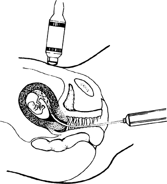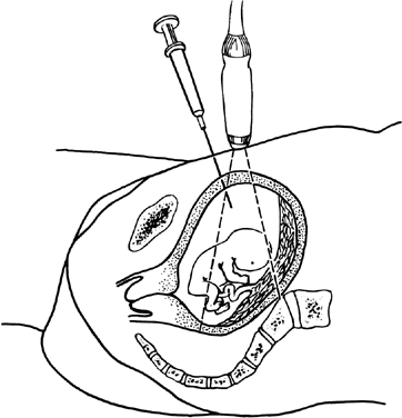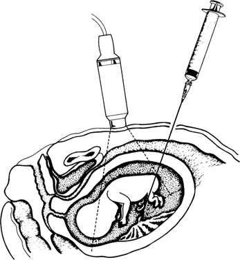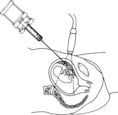 Traditional Amniocentesis: Gestation of 15 Weeks or Longer Amniocentesis, the aspiration of amniotic fluid, has traditionally been performed at and after 15 to 17 weeks of gestation. At this stage of gestation, the volume of amniotic fluid is about 200 mL. The ratio of viable to nonviable cells in the amniotic fluid is relatively high,1 thus allowing timely culture and diagnosis of fetal cytogenetic abnormalities and providing women the option of pregnancy termination should an abnormality be determined. Amniocentesis is routinely performed in an outpatient facility. An ultrasound examination should be done immediately before the procedure to evaluate fetal number and viability, perform fetal biometric measurements to confirm gestational age, establish placental location, and estimate amniotic fluid volume. In our hospitals, a fetal anatomic survey to screen for major anomalies is standard practice. In addition, ultrasonography may be useful in discovering maternal gynecologic conditions (e.g., leiomyomata) that could influence the technique and timing of the amniocentesis. After the preoperative ultrasound examination has been completed, a needle insertion site is chosen. We prefer to insert the needle in the midline fundal area of the uterus, but this is not always the site at which the optimal pocket of amniotic fluid is located. Not infrequently, a lower uterine segment or lateral approach is required. If possible, we avoid the placenta; however, transplacental amniocentesis has not been shown to reduce the safety of amniocentesis.2–4 If tapping the optimal pocket of fluid requires traversing the placenta, we select the thinnest portion of the placenta possible through which the needle can be directed. The umbilical cord insertion site should be identified and avoided. The maternal bowel and bladder should also be located, because these should likewise be avoided. A local subcutaneous anesthetic (e.g., 2 to 3 mL of 1% lidocaine) may be used, but we usually find this unnecessary. After the maternal skin is cleaned with an iodine-based solution, sterile drapes are placed around the needle insertion site to help maintain an aseptic field. We prefer a 22-gauge spinal needle and recommend no larger than a 20-gauge needle. Ultrasonographic monitoring with continuous visualization of the needle should be used throughout the procedure. Ultrasound gel is applied adjacent to the insertion site, and a real-time ultrasound transducer is held in position such that the ultrasound beam is directed parallel to the planned needle track. Needle insertion should be performed with one smooth continuous motion until the needle tip is within the amniotic cavity (Fig. 1). Some practitioners locate the needle tip within the subcutaneous fat and assess the distance from tip to amniotic cavity as well as the appropriate needle angle required to successfully enter the amnion and avoid maternal structures and the fetus. The first several milliliters of amniotic fluid are aspirated into a syringe. These first few milliliters are theoretically most likely to contain maternal cells; therefore, this initial sample is usually discarded or set aside for an AFP assay. For a second-trimester amniocentesis performed at 14 to 20 weeks inclusive, 20 to 30 mL of amniotic fluid is usually aspirated. After obtaining the amniotic fluid, the specimen should be clearly labeled and transported at ambient temperature to the laboratory. The amniotic fluid aspirated is bloody in approximately 1% to 2% of amniocenteses. The blood, which is almost always maternal in origin, does not adversely affect amniotic cell growth. Indeed, the performance of a transplacental amniocentesis may increase the risk for a bloody tap; this has not been shown to have an adverse affect on the safety or accuracy of the amniocentesis. By contrast, brown or dark red or wine-colored amniotic fluid is associated with an increased likelihood of adverse pregnancy outcome. This color indicates earlier intra-amniotic bleeding, with hemoglobin breakdown products accounting for the pigment. Pregnancy loss eventually occurs in about one third of such cases.5 If the abnormally colored fluid is also characterized by an elevated AFP level, the risk for adverse perinatal outcome (fetal death, anencephaly, spontaneous abortion, or fetal abnormality) is usually further increased. Green amniotic fluid, presumably due to meconium staining, is apparently not associated with poor pregnancy outcome.6–8 By contrast, brown amniotic fluid has been associated with an increased risk of fetal aneuploidy.8 The propriety of administering Rh immunoglobulin (RhIG) to prevent Rh immunization in unsensitized women with Rh-positive fetuses remains controversial although widely done. Fetomaternal transfusion by disruption of the fetoplacental circulation logically might have an immunizing effect; however, the magnitude of the risk has not been determined. The task is difficult because one must consider such variables as ABD compatibility, number of needle insertions, placental location, and the amount of fetal blood transfused into the maternal circulation. Early investigators considered that prophylactic RhIG should not be administered following genetic amniocentesis,9 but almost all now advocate its routine use.10–13 The dose to be administered is controversial. The American College of Obstetricians and Gynecologists recommends that 300 μg of RhIG be administered for an exposure of 30 mL of fetal blood.14 In the United Kingdom, the recommended dose of RhIG is 50 μg before 20 weeks of gestation and 100 μg thereafter.15 We routinely administer 300 μg of RhIG following genetic amniocentesis, regardless of whether the needle may have traversed the placenta. Following amniocentesis, fetal heart motion should be documented by ultrasonographic visualization. The patient is observed briefly following the procedure and is instructed to report any vaginal fluid loss or bleeding, uterine 