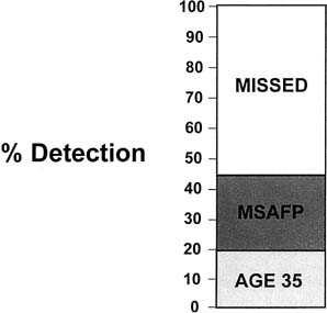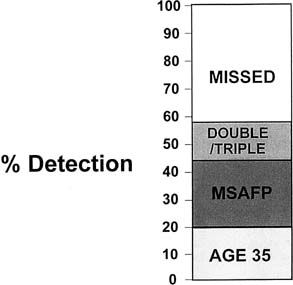 Neural Tube Defects In the 1970s, Brock and Sutcliffe5 first described the use of AFP in amniotic fluid and later in maternal serum6 for the prenatal detection of neural tube defects. Routine prenatal screening has been accepted in the United Kingdom since the mid-1970s and in the United States since the mid-1980s. Evaluation of the impact of such screening has shown that the birth rate of children with neural tube defects has declined from 1.3 per 1000 births in 1970 to 0.6 per 1000 births in 1989.7 In some sections of the United States, such as the Southeast, which had higher than average rates, the decline has been even more dramatic. Several changes in the epidemiologic characteristics of neural tube defects have been observed: (1) The proportion of spina bifida cases has increased. (2) The proportion of neural tube defects combined with other unrelated defects (i.e., syndromes) has increased. (3) The incidence in the white population has decreased relative to the incidence in other races. (4) The incidence of isolated neural tube defects in females has decreased. All of the aforementioned findings are consistent with increased use of maternal serum AFP screening, particularly in the white population. A similar study in South Australia by Chan and colleagues8 from 1966 to 1991 found that the overall prevalence of neural tube defects (including prenatally diagnosed cases) had not varied between the two years. There was an 84% reduction in births, however, from 2.29 per 1000 in 1966 to 0.35 per 1000 in 1991. The fall was 96% for anencephaly and 82% for spina bifida. Approximately 85% of open and closed defects were detected before 28 weeks’ gestation by AFP or ultrasound. Likewise, the proportion of terminations in prenatally detected cases has risen steadily, from an average of about 20% in 1980 to greater than 80% in 1991. It has long been appreciated that there are racial, geographic, and ethnic variations in the incidence of neural tube defects and that patients are at increased risk based on other medical conditions. Diabetics are known to have an increased risk of neural tube defects, as are women taking antiepileptic drugs.9 Conversely, a 1992 study concluded that patients undergoing ovulation induction do not have higher than background rates of neural tube defects.10 An important question has been the association of folic acid, its deficiency, and the incidence of neural tube defects. Experimental, clinical, and embryologic studies have investigated the role of vitamins as a causative factor. Special attention has been focused on the essential B vitamin, folic acid, which serves as a methyl donor involved in nucleic acid synthesis, purine-pyrimidine metabolism, and protein synthesis.11 Because of increased folic acid needs in pregnancy, pregnant women are particularly prone to develop relative deficiencies. Other possible influences include insufficient diet; physiologic hemodilution of pregnancy; increased plasma clearance; and genetic disorders that might affect production, transport, and metabolism.12 Throughout the 1990s, there have been many studies attempting to supplement folic acid in women at high risk for neural tube defects that generally have shown a decrease in the recurrence risk for such women who already have had an affected child. The U.S. Food and Drug Administration mandated, beginning in 1998, folic acid supplementation of breads and grains. Our group has shown a dramatic drop in the proportion of high maternal serum AFP values in the United States after the introduction of routine supplementation of breads and grains.22 Another published study showed a 20% drop in neural tube defects based on certifiable data.23 Several others likewise have confirmed a remarkable decrease in incidence.24 Screening for Chromosome Abnormalities In 1984, Merkatz and coworkers25 first published the association of low maternal serum AFP with an increased risk of chromosome abnormalities, particularly Down syndrome. In subsequent years, there has been gradual acceptance of the association and an understanding that Down syndrome is not the only aneuploid condition associated with low maternal serum AFP. Trisomy 18 has even lower AFP values.26 The adoption of wide-scale screening with maternal serum AFP effectively doubled the potential detection of chromosome abnormalities in the population. Even with an aging reproduction population, only 25% to 30% of Down syndrome infants are born to women older than age 35 (Fig. 1). The addition of a well-coordinated maternal serum AFP screening program can detect approximately 30% of the 80% of cases that are born to women younger than age 35. The mechanics of biochemical screening (i.e., with adjustments for gestational age, race, diabetic status, multiple gestation status, and maternal weight and adjustments via a different database or correction factors for maternal race) have been published previously and are not repeated here.27 In 1988, Wald and associates28 suggested that a combination of parameters including AFP, β-human chronic gonadotropin (β-HCG), and unconjugated estriol could significantly increase the detection frequency of Down syndrome to approximately 60% of the total (Fig. 2). Multiple studies have corroborated the increased efficacy of multiple marker screening as opposed to AFP alone in detecting chromosome abnormalities, particularly Down syndrome.29,30,31,32,33,34 Despite overwhelming data and recommendations of national organizations such as the American College of Obstetrics and Gynecology that multiple marker screening be offered, nearly 20% of patients in the United States who have screening still have AFP alone.35 There is essentially universal agreement that among the three common parameters used, AFP, β-HCG, and unconjugated estriol, that if one could choose only one of the above, that β-HCG is the best. There is a virtual tie for second place in efficacy between AFP and unconjugated estriol. Because AFP al