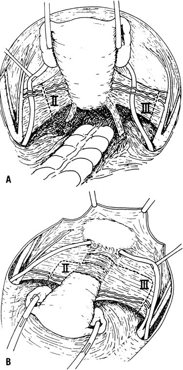 In 1974, Piver and colleagues proposed a new classification system to clarify the ambiguities of the existing terminology used to differentiate types of abdominal hysterectomies.46 This system describes the extent of dissection of hysterectomies performed for various stages of cervical cancer, thereby identifying potential surgical complications. The following is a limited description of each procedure; a complete discourse on the technique for each type of hysterectomy can be found in several texts and atlases.47,48,49,50,51,52 The type 1 hysterectomy is commonly referred to as the extrafascial, or simple, hysterectomy. This hysterectomy removes the cervix along with the uterine corpus, but does not require mobilization of the ureter or removal of a significant amount of the parametria. The type 2 (modified) radical hysterectomy, or Wertheim operation, requires more extensive dissection than the extrafascial hysterectomy. The central portion of the parametrial tissues is removed while minimizing disruption to the ureteral and vesical vasculature. Thus, the medial half of the uterosacral ligaments and the cardinal ligaments are removed as the uterine artery is ligated just medial to the point at which it crosses the ureter. Removal of a 1- to 2-cm portion of the upper vagina and pelvic and para-aortic lymphadenectomy are nearly always performed in conjunction with a type 2 radical hysterectomy. The type 3 radical hysterectomy, originally described by Meigs, aims to remove as much parametrial tissue as possible. The uterosacral ligaments are transected near their origin from the sacrum. The cardinal ligaments are excised as widely as possible after the uterine artery is ligated at its origin where it branches off the hypogastric artery. Care should be taken to preserve the superior vesical artery. Removal of a 2- to 3-cm portion of the upper vagina and a pelvic and para-aortic lymphadenectomy are performed in conjunction with a type 3 radical hysterectomy (Fig. 1).