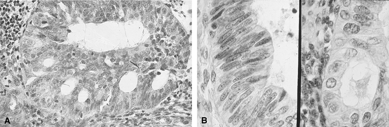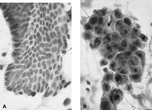 By definition, adenocarcinoma of the endometrium is an invasive disease, invading either the endometrial stroma or the underlying myometrium of extrauterine tissues. Most endometrial carcinomas maintain endometrioid differentiation; these also can contain areas of mucinous or squamous differentiation. Other nonendometrioid subtypes seen in routine practice include clear cell carcinoma, papillary serous carcinoma, and other rare variants. According to the U.S. Gynecologic Oncology Group histologic grading system,1 grade 1, well-differentiated carcinoma, consists of a neoplasm with less than 5% of solid cancer; grade 2, moderately differentiated carcinoma, contains 6% to 50% solid cancer; and grade 3, poorly differentiated carcinoma, contains more than 50% of solid tumor. Tumor grading is of greater independent prognostic value for endometrioid endometrial adenocarcinoma and its related types (i.e., endometrial, secretory, mucinous, squamous) than for papillary serous and clear cell adenocarcinomas. Papillary serous and clear cell cancers do not show the grade-dependent changes in aggressiveness seen with the endometrioid tumors; instead, as a group they are consistently aggressive. Division of endometrial adenocarcinomas into the clinicopathologic classes of endometrioid and nonendometrioid types is paralleled further by differences in epidemiologic risk factors and precursor lesions.2,3 Type I, or endometrioid, endometrial adenocarcinomas are more frequent in women taking exogenous estrogen and often are preceded by precursor lesions, which is the subject of this discussion. It has traditionally been suggested that endometrioid endometrial adenocarcinoma is preceded by endometrial hyperplasia (EH).4 EH previously was considered a continuum of morphologic changes often beginning with simple glandular/stromal overgrowth (simple hyperplasia) and ending with complex, highly atypical histologic and cytologic proliferations, variously referred to as atypical adenomatous hyperplasia, dysplasia, or carcinoma in situ. The figure most often cited in the literature for progression of atypical adenomatous hyperplasia to carcinomas was 30% at 10 years.4 When the relevant laboratory and clinical evidence was critically reviewed, it became apparent that the only important morphologic feature distinguishing endometrial lesions from those without significant invasive potential is cytologic atypia of gland cells.5,6,7,8,9 Histologically, lesions without invasive potential lack cytologic atypia (Fig. 1). Their nuclear characteristics are similar to those of normal, cyclic, proliferative gland cell nuclei. Development of useful architectural criteria to be used in conjunction with cytologic atypia for precancer diagnosis is an area of active investigation (see Emerging Concepts later). Traditionally the most frequently used terms for hyperplastic endometrium without atypia include cystic glandular hyperplasia and adenomatous hyperplasia. The International Society of Gynecologic Pathologists adopted the terms simple and complex hyperplasia instead of cystic glandular and adenomatous hyperplasia.10 Clinically, most cases of EH regress either spontaneously or after conservative progestogen-suppressive therapy.7 In contrast to EH, glandular proliferations with significant nuclear atypia are endometrial carcinoma precursors.5,6,7,8,9,11 In a prospective study with a mean follow-up of 7 years, none of the 65 women with EH without atypia developed carcinoma, whereas carcinoma was diagnosed in 5 of 20 women with endometrial intraepithelial neoplasia (EIN).7 Cytologically and by morphometric analysis, these cells resemble9,11,12,13 and many times are indistinguishable from cells in well-differentiated invasive carcinoma (Fig. 2). These lesions have been variously referred to as atypical adenomatous hyperplasia and severe or atypical complex hyperplasia. The International Society of Gynecologic Pathologists proposed the term atypical hyperplasia (adenomatous with atypia).10 The morphologic criteria for distinguishing among the various subsets of hyperplastic endometrial lesions are presented in Table 1. Excluded from hyperplasias are anovulatory persistent proliferative endometrium, focal glandular crowding without atypia, postmenstrual regenerative endometrium, and focal cystic dilation of glands. These conditions should not be considered part of or be confused with EH.14 Although the term atypical hyperplasia (AH) is the generally accepted nomenclature, we prefer EIN.12 Lesions devoid of atypia are not cancer precursors, whereas lesions with cytologic atypia may progress to carcinoma if untreated; it is logical to use two different terms for lesions that have different biologic behavior. EIN is not synonymous with invasive carcinoma but indicates a lesion that may regress, persist, or progress to invasion. Progression rates of surgically untreated EIN range from 25%7 to 58%.11 Morphologically, stromal invasion distinguishes invasive carcinoma from EIN. Stromal invasion (intramucosal carcinoma) usually manifests with inflammation or necrosis of the area being invaded or still desmoplasia of the stroma, or the glands have a ragged contour or replace large portions of preexisting endometrial stroma.