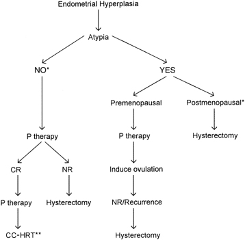 Although there are no bona fide treatment regimens for EH, most current guidelines recommend either medical or surgical treatment of women with EH (Fig. 8). The choice depends on the histopathologic form of hyperplasia, the reproductive status of the woman, whether the patient is on estrogen-only replacement therapy, and her general health. In women who desire to conceive, the initial treatment should include progestational suppression, regardless of whether the lesion is classified as hyperplasia with or without atypia or even well-differentiated adenocarcinoma. Although this approach may undertreat an adenocarcinoma, previous experience suggests that the risk of these women having myometrial invasion is exceedingly small (0.6%).48 Although some cases of AH/early intramucosal adenocarcinoma respond to exogenous progestogens, ovulation inducers, or both, in most cases the lesions tend to recur within a few months to a few years after delivery of the newborn. Medical hormone therapy is also given to women whose general health is unsuitable to withstand surgery. Surgery (i.e., transabdominal hysterectomy) with or without bilateral salpingo-oophorectomy is recommended for women who have persistent EH without atypia but are symptomatic (abnormal uterine bleeding) and women in the postreproductive age group with AH. Surgery is justified in this group in the face of 25% to 35% progression rates to invasion and an 80% failure rate to respond to progestational therapy.7 There is no compelling evidence to indicate that women with complex hyperplasia without atypia (formerly known as adenomatous hyperplasia) respond less favorably to progestational therapy than women with simple hyperplasia.7 Women who develop EH with or without atypia during estrogen-alone replacement therapy may benefit from the addition of progestins into their replacement regimen. The rare patient (1%) who develops EH while on combined cyclic or continuous HRT37 may benefit from either higher doses of combined HRT or simply switching to a progestin-only replacement therapy for 3 months to attempt reverting the hyperplastic endometrium to normal. It has been shown that duration of progestin administration is crucial for inhibiting endometrial mitotic activity; this is important because control of endometrial growth is primarily related to control of epithelial mitotic activity. Inhibition of endometrial mitotic activity is noted after 11 days of progestin treatment.49 The most frequent hormone preparations used for medical treatment of evaluated hyperplasia with or without atypia are presented in Table 6.