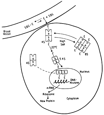 It is now known that estrogens exert their end-organ effect by activating a complex intracellular mechanism. Tissues which respond to estrogen possess intracytoplasmic proteins (receptors) that preferentially bind specific steroids (Fig. 2). For instance, a cell from the uterus will possess 5,000 to 15,000 estrogen receptors whereas a cell from the spleen will have none. These receptors recognize estrogens by their three dimensional and chemical characteristics and bind it with high affinity (KD =10-10), specificity, and saturability. The estrogen molecules present in the circulation are relatively loosely bound to intravascular carrier proteins (sex-steroid-binding globulin [SBG]) (KD = 10-8) or to albumin. In excess of 95% of the estrogen in the circulation is found in the bound form. The estrogen readily diffuses across the cell membrane in its active free form due to a concentration and a binding gradient. The estrogen molecule is relatively small (molecular weight is 300) and lipophilic and probably passes through the cell membrane by simple diffusion. Once in the cell, the estrogen is promptly bound to the intracellular (intracytoplasmic) receptor protein, which then undergoes a series of complex spatial changes prior to intranuclear transport. This nuclear transport occurs within 30 to 45 minutes after the target tissue is exposed to estrogen. The following system of nuclear interactions between receptor and DNA is a model that has been proposed by McCarty3. The activated receptor-estrogen complex then nonspecifically binds to the DNA and protein of dispersed chromosomes (euchromatin) and stimulates acetylation of the histone protein. This acetylation of the histones in nucleosomes causes the nucleosome to “open up” and expose specific DNA segments for transcription. The “estrogen message” is transcribed into new messenger RNA which then migrates back into the cytoplasm and activates various cellular processes including new protein synthesis. The now “freed” receptor protein is probably recycled back into the cytoplasm for further use3,4. The estrogen receptor recognizes a molecule as being “estrogen” if its size, three-dimensional configuration, and charge are similar to the parent molecule. Therefore, the nonsteroidal synthetic estrogens may not resemble the “prototype” estrogen (estradiol-17β) on paper diagrams but are very similar in shape and other properties as seen by the cellular receptor. Estrogen receptors are perhaps the determinants of potency for estrogenic substances. The estrogen receptors preferentially bind estradiol over estriol (2x) and estrone (3x)5. This receptor also discriminates among the estrogens by binding estradiol within the cellular nucleus longer than the weaker estrogens estriol and estrone4,6. Therefore, estradiol is the most potent of the natural estrogens probably because of the greater affinity and duration of its receptor-binding compared with the other available estrogens. Receptors for estrogen and other steroid hormones can now be accurately quantified and studied. Estrogen in physiologic concentrations stimulates the synthesis of estrogen receptors and of progesterone and testosterone receptors7. Progesterone and testosterone, however, inhibit estrogen receptors. Progesterone inhibits its own receptor population in the secretory phase of human endometrium8. Thus, it is apparent that for estrogen to bind and influence a tissue, the specific estrogen receptors must be present. The potency of a particular estrogen in a tissue roughly parallels and is probably dependent on the quantity of the estrogen receptor in the cells of that tissue. Studies with estrogen receptors in breast cancers are being successfully utilized to predict the responsiveness of these tumors to hormonal manipulation9,10. Endometrial carcinoma is another malignancy that can be hormonally dependent and manipulated by endocrine therapy. Both normal endometrium and endometrial carcinoma possess active estrogen receptors. There have been few reports showing qualitative or quantitative changes in estrogen receptors in hyperplastic endometrium or endometrial cancer, but the potential exists and detailed investigation is beginning. An intriguing theory has been proposed linking endometrial carcinoma to the relative levels of estrone and estriol in the postmenopausal female11. This theory ascribes a protective effect to estriol over estrone. Clearly, estrone is the dominant estrogen in postmenopausal women and also in younger women with polycystic ovarian disease; therefore, it has been implicated in the etiology of endometrial carcinoma. A protective effect from cancer for estriol was proposed when epidemiologic studies demonstrated higher estriol-estrone ratios in control groups as compared with groups with endometrial or breast cancer12,13, but other studies have failed to demonstrate these findings14,15. As noted, the receptor data show estrone and estriol competing for binding on about an equimolar basis, with similar decreases in duration of nuclear binding as compared with estradiol. There is no evidence that estriol has a different or less carcinogenic induced cellular response than estrone. Therefore, in postmenopausal patients, the unopposed levels of estrone and estriol are probably inducing the same cellular response. The concept that estriol binds to the receptor and produces a “benign” product or that it occupies the receptor for a long period of time and blocks estrone binding is not substantiated by current data. Therefore, the theory of a protective effect of estriol must rest on epidemiologic data which is conflicting and weak. Effects of Progesterone Progesterone is produced and secreted by the adrenal cortex, ovary, and placenta. From the ovary, the progesterone secretory rate is negligible during the follicular phase and increases dramatically after ovulation, yielding 30 mg per day between the 18th and 24th day of the cycle. Greater t