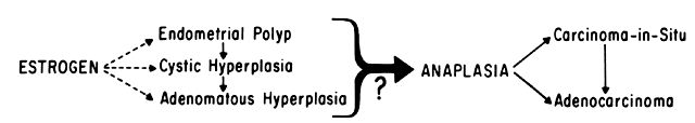 The background of adenocarcinoma of the endometrium remains a subject of lively debate. One group presents an argument for the pathogenesis of the disease as arising in women with certain inherited phenotypes accompanied by certain endocrinologic disturbances. The cancer itself, according to this hypothesis, is the end product of an abnormal histologic process which begins as simple hyperplasia and progresses stepwise to adenocarcinoma of the endometrium (Fig. 3). The role of ovulatory failure in this neoplastic process is stressed. Ovulatory failure with the resultant lack of progestational modification of constant estrogen stimulation is thought to be contributory to or directly cause endometrial cancer. The other side of this debate presents endometrial cancer as arising in a certain area of the endometrium as a result of causes yet unidentified but not specifically related to hormonal functions. The cancer is presumed to arise by some mutation of the endometrial epithelium which gives it a malignant character. While perhaps endometrial carcinoma may be found coexistent with hyperplasia, it is not necessarily derived from it. There are increasing data to support the former argument. Interest in a common somatotype and endocrine profile in patients with endometrial carcinoma has been present for years. Clinical Profile AGE. Patients are usually postmenopausal. HEREDITY. Gusberg and Frick40 have drawn attention to a positive family background for cancer in patients with endometrial cancer. This, plus the finding of corpus cancer in twins, suggests a hereditary linkage (predisposition) for this malignancy. ECONOMIC STATUS. A number of studies have pointed out that patients with endometrial cancer tend to be from the higher socioeconomic groups. Whether this reflects nutritional or activity differences, different medication exposure or other factors is unknown. SOMATOTYPE. Sheldon, Hartl, and McDermott41 in 1949 drew attention to the fact that women with breast cancer were of the “burgeoning” type, ie, big, tall, and obese. Similar somatotypic descriptions are quite common among patients with endometrial cancer. Such patients are often massively obese, and there are numerous reports documenting obesity as a common finding among patients with endometrial malignancy. Chronic anovulation with unopposed estrogen is more common in obese women. PARITY. Speert42 in 1948 demonstrated the relatively low parity found in women with this malignancy. Many others have made similar reports and suggested that this lower parity is often due to infertility rather than the elective avoidance of childbearing. MENSTRUAL HISTORY. Reports by Hertig et al43, Dockerty and co-workers44, and others have illustrated that patients in whom endometrial cancer was found often had a history of significant menstrual dysfunction. Analysis of these problems suggests a common theme: anovulation and excessive bleeding due to hyperestrogenism and possibly hyperplasia of the endometrium. Thus, it would appear that abnormalities of menstruation, particularly those of excessive flow, have an important place in the background of the woman with endometrial adenocarcinoma. PRIOR AND ACCOMPANYING DISEASES. There seems to be a significantly higher incidence of several diseases among patients with endometrial cancer when compared with controls without neoplasia. These include diabetes mellitus (16 times increased, Palmer45), hypertension (although close comparison after age and obesity correction reduces this association), fibromyoma uteri (3 times increased in earlier studies but now thought only to be coexistent and not associated), and a variety of anovulatory and hyperestrogenic states including the polycystic ovarian syndrome and functioning ovarian neoplasms (predominantly estrogen- and androgen-producing). All of these findings have suggested certain common symptoms and endocrine features in women with endometrial cancer. These data plus data derived from animal models and from human responses all suggest prolonged estrogenicity may be a cause of endometrial cancer. Endocrinologic Profiles Detailed endocrinologic studies of patients with adenocarcinoma of the endometrium were rare before 1965. Rapid advances in laboratory methodology are now providing such studies, but in many areas the answers remain unclear. GONADOTROPINS. The observation by Sherman and Woolf46 of increased gonadotropin excretion by patients with endometrial cancer has not been confirmed by subsequent studies. Dillman et al47, however, have reported that there may be a significant increase in immunologically reactive luteinizing hormone as compared with biologically active luteinizing hormone when patients with endometrial cancer are compared with normals. He also suggested a qualitative difference in. the carbohydrate moiety of the gonadotropins in these two groups of patients. The role of gonadotropins in these diseases remains to be determined. GROWTH HORMONE. Because of the association between diabetes, obesity, and endometrial carcinoma, a possible role for growth hormone in this disease was postulated. Benjamin and Romney48 reported that mean growth hormone levels during 6-hour glucose tolerance tests were significantly higher in patients with adenocarcinoma of the endometrium than in controls. Further investigation is required to assess the significance of this finding. ESTROGEN AND PROGESTERONE. O'Malley49 and Lucas50 have reviewed the roles of estrogen and progesterone at the cellular level in patients with and without endometrial cancer. Estradiol-17β is rapidly bound to DNA chromatin in endometrial cells. Therefore, the template capacity for RNA synthesis is increased as it is for RNA polymerase activity. This information suggests a direct carcinogenic effect of estrogen at the level of DNA transcription. In general, no major differences in serum concentrations, production rates, and metabolic clearance rates for androgens and estrogens in norm