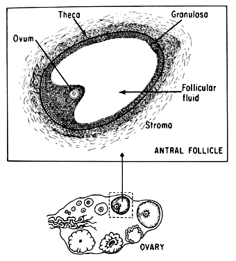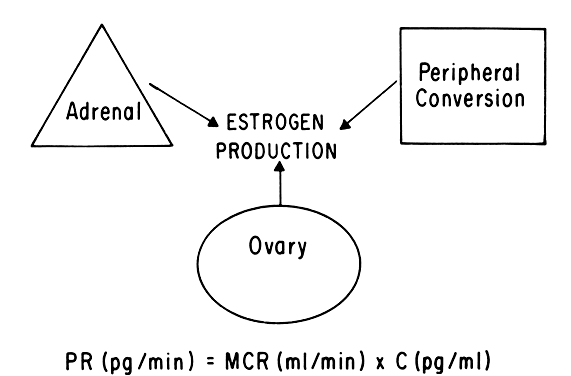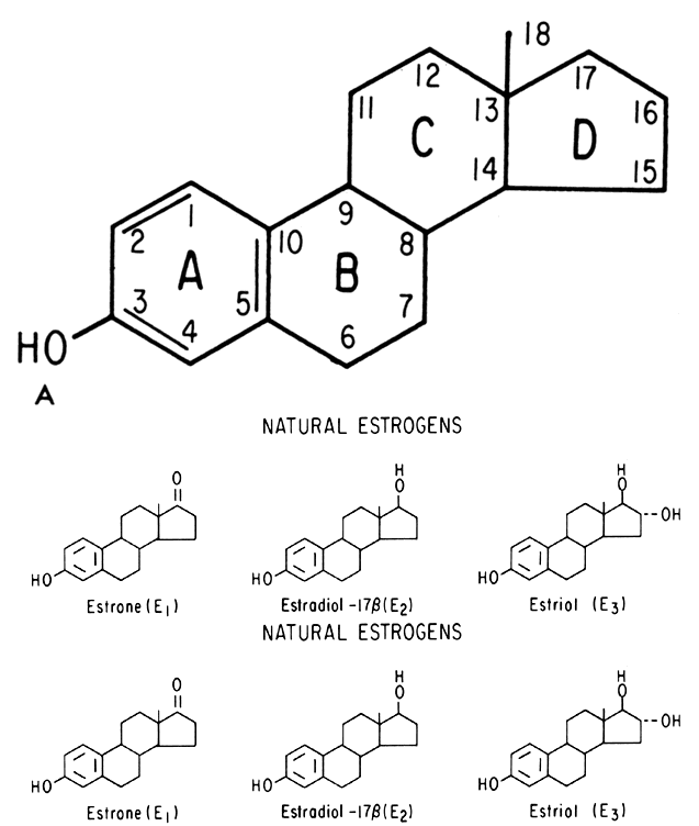 There are three naturally occurring estrogens: estrone (El), estradiol-17β (E2), and estriol (E3). Every natural estrogen molecule has 18 carbon atoms. As depicted in Figure 4A, the aromatic A ring is common to them all along with a phenolic group at C-3. They differ only in the number of hydroxyl groups: estrone, OH- at C-3; estradiol, OH- at C-3 and C-17; and estriol, OH- at C-3, C17, and C-16. The synthetic estrogens are chemically manufactured and have various additions to the basic C-18 molecule or do not chemically resemble natural estrogens at all. Natural estrogens may be artificially synthesized but the C-18 molecule contains no additions other than the natural hydroxyl groups (Figure 4B). All natural estrogen molecules originate from C-19 androgen precursors (androstenedione or testosterone). This C-19 to C-18 conversion step depends on a series of aromatizing enzymes which are present in the adrenal gland, the ovary, the placenta, and certain body tissues which do not primarily produce steroid hormones (peripheral conversion sites). Peripheral conversion of androstenedione or testosterone to estrogen occurs most efficiently in adipose tissue and in the liver. Only the adrenal gland and the ovary are capable of synthesizing estrogens from acetate and cholesterol. This is not to say that they synthesize equal amounts of estrogen: each steroid-producing gland has major and minor synthetic pathways leading to vastly different amounts of end products. These pathways are controlled by enzyme concentrations and kinetics. An example is the adrenal gland, which is enzymatically “programmed” to primarily produce glucocorticoids and only secondarily to make sex steroids. The basic pathway of sex steroid synthesis is illustrated (Fig. 5). When the ovary secretes estrogen as it does during the reproductive years, the ovarian follicle is the site of steroid synthesis (Fig. 6). The follicular theca cell has long been a known source for estrogen production, but only recently have in vitro ovarian tissue culture experiments implicated the follicular granulosa cell as a significant estrogen producer. The granulosa cells lack a C-21 to C-19 step because of a relative desmolase deficiency. But when provided with a C-19 androgen precursor, they quickly convert it to estrogen. The relative contributions of theca and granulosa cells to ovarian estrogen secretion are unknown at this time. The ovary containing the dominant follicle, that follicle which will go on to eventual rupture and ovulation, produces the most estrogen, as determined by simultaneous sampling of both ovarian veins during the proliferative phase of the: menstrual cycle. The unruptured preovulatory follicle contains estrogen in 1,000-fold concentrations over peripheral blood, but the physiologic function is uncertain. Estrogens can be measured in body fluids (serum and urine) by hormone assays. The bioassays use a quantitative change in an estrogen responsive animal organ (ie, rat uterine weight change) and are now of only limited usefulness in clinical medicine. The modern assay technique is by radioimmunoassay. Since estrogens are lipid soluble, an ether extraction step is used to separate steroids from other serum components. Careful technique requires quantitating the efficiency of ether extraction which is usually about 80%. A specific estrogen antibody is then used along with tritium-tagged estrogen tracer to measure the antibody-tracer displacement potential of the unknown sample. The amount of tracer displaced varies directly with the amount of estrogen in the unknown sample, as shown in the following equation:
