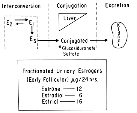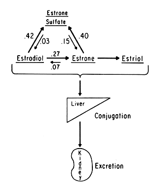 Before the advent of sophisticated metabolic studies, little was known about the extent of interconversion among the natural estrogens. To measure these changes, pure estrogen compounds with a radioactive label (tritium) must be injected into normal individuals, with subsequent determinations of production rates, metabolic clearance rates, and serum concentrations of E1, E2, E3 and E1-sulfate. For example, after allowing sufficient time for equilibrium, the extent of conversion of radioactively labeled estradiol to estrone can be determined by measuring the amount of tritium incorporated into estrone. A summary of these interconversions is presented in Figure 11 33,34. The principal source of estrone sulfate is from estrone and estradiol33. A significant amount of estradiol (27%) is converted to estrone after intravenous injection in normal females between 21 and 35 years old34. The majority of estrogens are converted to estriol prior to excretion.