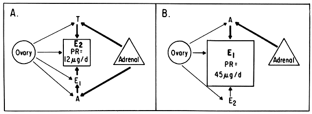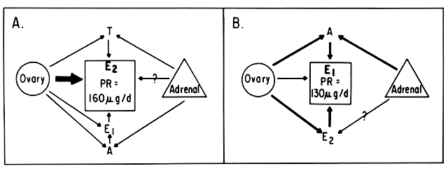 The three natural estrogens vary in their relative concentrations throughout the lifespan of the human female. Each stage of life has its dominant estrogen: prepubertal, estrone; reproductive, estradiol; and postmenopausal, estrone. The two extremes of life with the absence of menstrual function are associated with the weak estrogen estrone. Puberty The normal girl under 8 years of age has no clinical signs of estrogen function. Average peripheral levels for E1 are 25 pg/ml and for E2 are 10 pg/ml. In early puberty, the increased E1 levels occur secondary to adrenal function. Estrone is elevated prior to the onset of pituitary gonadotropic stimulation of the ovaries and the emergence of E2 as the dominant estrogen in the reproductive female. Therefore, thelarche (breast budding) as the classical first sign of puberty is primarily a function of the adrenal gland24. This estrone is probably secondary to peripheral conversion of adrenal androgenic precursors. Reproductive Age Normal levels of estrogen in menstruating women are presented in Table 1. After puberty is well established, the ovaries become the dominant organs for estrogen production. Their principal product is the most potent form of the natural estrogens, ie, estradiol. There is a small contribution to total E2 from conversion of El, perhaps from direct E2 secretion by the adrenals, and from peripheral conversion from testosterone, but the bulk (90%) of E2 is from direct ovarian secretion (Fig. 9A). In comparing the changes in serum estrogen concentrations after oophorectomy in normal cycling females, it is apparent that the adrenal contributes about 10% to the estradiol pool25. TABLE 1. Average Estrogen Concentrations During the Menstrual Cycle