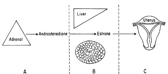 MacDonald53 and Siiteri54 have explored the role of altered peripheral conversion of prehormones to estrogen, proposing this as a possible linkage to endometrial cancer. They found that young women with polycystic ovarian disease and obese women with endometrial cancer tend to produce excessive amounts of estrone via increased aromatization of androstenedione. This conversion rate was found to be independent of the ovarian, adrenal, or uterine function in the subjects studied. Although they found that the production rate of androstenedione decreases in the postmenopausal woman to about half that of the premenopausal patient, the conversion of androstenedione to estrone almost doubles in the normal patient. The adrenal thereby provides essentially all of the estrone produced (Fig. 13). A striking observation was the marked elevation in the amount of androstenedione converted to estrone in patients with endometrial hyperplasia or cancer. These findings led to the “estrone hypothesis,” which proposes that estrone is the etiologic agent in endometrial carcinoma. This hypothesis is based on the observed fact that estrone is the dominant estrogen in the clinical syndromes at risk for these diseases. In polycystic ovarian disease (PCOD) there is a definite increased incidence of endometrial neoplasia (80% of the cases in women under 40 years old). Women with PCOD have increased androstenedione production rates. With increased levels of androstenedione, the estrone/estradiol ratio is increased in these women, An increased conversion rate has been demonstrated to closely correlate with age and obesity after the menopause has been reached. The very obese older woman may have a 15- to 20-fold increase in the androstenedione conversion rate. Therefore, a woman with a genetic and/or environmental predilection to develop endometrial adenocarcinoma may develop this disease if she is exposed to relatively high sustained levels of estrone such as those found in patients with PCOD or in older obese postmenopausal females. There is no evidence that estrone stimulates the receptor and alters protein metabolism in a different manner than estradiol. As noted previously, estrone appears to bind to the estrogen receptor less actively and for a shorter period of time than estradiol. But in the normal cycling female with a dominance of estradiol there are inherent natural interruptions with an opposing steroid, ie, progesterone. If the more generally potent estrogen, ,estradiol, had the natural opportunity for long unopposed stimulation of susceptible endometrium as does estrone, then it too may have been implicated in the genesis of endometrial adenocarcinoma. Animal Data Greene55 described in 1941 a strain of rabbits which developed a toxemia of pregnancy, suffered liver damage, became infertile, and later developed anovulation, endometrial hyperplasia, and carcinoma of the endometrium. In 1952, Blurrows and Horning56 reported the induction of endometrial cancer with prolonged administration of exogenous estrogen to rabbits. Griffiths and coworkers57 showed that such neoplasia could be prevented by progesterone therapy. Similar phenomena have been observed in mice and rats. Cancer of the endometrium has not yet been induced by experimental hormonal therapy involving subhuman primates, but work continues in this important area. Human Therapeutic Data Less data are available to evaluate the possible role of chronically higher estrogen levels on the likelihood of development of endometrial carcinoma in humans. Certainly, the increased incidence of this neoplasm in patients with polycystic ovarian disease or functioning ovarian neoplasms (both of which involve high estrogen levels, anovulation, and no progesterone) suggests a possible linkage. A number of studies have focused attention upon a possible causal relationship between chronic estrogen replacement therapy and endometrial cancer58,59,60,61,62,63,64. In six of these studies, it was estimated that the incidence of endometrial carcinoma was increased from 7.5 to 12.5 times among patients who received estrogen therapy58,59,60,61,62,63. In general, these studies purport that the causal relationship only became manifest after long-term estrogen administration and that it was dosage related. One study questions the validity of this latter observation63, while others have not demonstrated any linkage at all between estrogen replacement therapy and endometrial adenocarcinoma65,66. Finally, several studies exist which have reevaluated prior positive studies and seemingly negated their results67,68. Thus, while the question of a causative role of estrogen therapy in the development of endometrial cancer remains to be absolutely proved, there is at least significant concern at this time. There are no major studies proving an increased incidence of other neoplasms elsewhere in the body in patients with estrogen-producing ovarian neoplasms or patients receiving estrogen replacement therapy. Several authors have drawn attention to the fact that the patients who receive estrogen therapy have, in general, a better prognosis and more well differentiated adenocarcinoma of the endometrium63,69. Whether this increased survival is solely due to the differentiation of the lesion or because of increased surveillance and earlier diagnosis of the estrogen-treated patient remains to be answered. Certainly, the patient who receives estrogen therapy warrants close supervision and both prompt and appropriate endometrial assessment for any abnormal bleeding. It may even become advisable to routinely sample the endometrium, even in asymptomatic patients on such therapy. Of great importance to this controversy regarding the possible linkage between estrogen therapy and adenocarcinoma of the endometrium is the possible protective role of added progesterone. Several studies have suggested that the regular addition of a potent synthetic progestin to estrogen therapy might reduce the inci