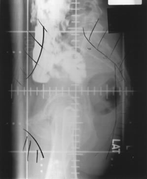 Radiation can be delivered by means of external sources (EBRT), implanted irradiation (brachytherapy), or radioactive fluid. This section discusses EBRT and brachytherapy. Radioactive fluid instillation is occasionally done intraperitoneally with P32, most commonly as adjuvant therapy in ovarian cancer. Some work has been done using P32 in patients with endometrial carcinoma with positive cytology82; this work will not be discussed further, however, because data are somewhat limited. EBRT is used to irradiate areas thought to be at risk for disease recurrence, including the whole pelvis, the whole pelvis plus the para-aortic nodal region, and the whole abdomen. EBRT is produced by cobalt machines or linear accelerators. As the energy of radiation increases, the beam penetration also increases, making it possible to limit the peripheral radiation needed for delivery of a desired dose at depth. Because the pelvis has a relatively thick separation, higher energy beams are preferred. Whole-abdominal irradiation is used to irradiate the entire abdominal contents. With modern radiation machines, this usually can be accomplished with a single setup, treating with an anterior and posterior field. The total whole-abdominal dosage is usually limited to 2000 to 3000 cGy in fractions of 100 to 150 cGy per treatment. Vital organs may need to be shielded to limit the radiation dose. The kidneys should be shielded to limit the dose to approximately 1800 cGy; liver shielding should also be considered if the dose exceeds 2500 cGy. Whole-abdominal irradiation in endometrial cancer is usually followed by a boost to the pelvis, preceded in many situations by a para-aortic nodal boost. Treatment of the para-aortic nodes can be accomplished with either separate fields matched to the pelvic field or in continuity with pelvic radiation fields. I prefer to use a single field to avoid problems of matching. The para-aortic nodes can be treated with a two-field or four-field technique, generally to a total dosage of 4000 to 4500 cGy at 170 to 180 cGy per fraction. If a two-field technique is used, care must be taken to ensure that the dose to the spinal cord is limited to less than 4500 cGy. If a four-field technique is used, the location of the kidneys must be verified to avoid exceeding kidney tolerance. Whole-pelvic irradiation can be accomplished by either a two-field or four-field technique. To avoid excessive maximal dosages, the two-field technique should be used only with high-energy beams. The two-field technique uses opposed anterior and posterior fields (Fig. 1). The upper border of the field is generally placed at the L4-5 or L5-S1 interspace. If there is no disease extension into the vagina, the lower border should encompass one half to two thirds of the vagina. The lateral borders should be placed approximately 1.5 cm lateral to the bony pelvic rim. A marker should always be placed to indicate the location of the vaginal cuff/cervix or the most distal aspect of tumor extension. The four-field technique allows lateral shielding of structures that cannot be shielded in the anteroposterior field. This is my preferred method of pelvic irradiation. In the four-field technique, the upper and lower field borders are identical to those in the two-field technique. The anterior border of the lateral field is placed at or anterior to the anterior pubic symphysis. The posterior border is placed at the S2-3 interspace unless tumor extension necessitates larger fields. An example of a lateral field is shown in Figure 2.